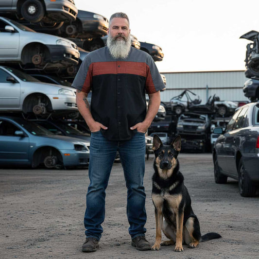 MMCC Men's Pit Stop Mechanic Button Up Shop Shirt, Reflective Strip, 2-Chest Pockets - Black-Orange-Grey - MMC16010