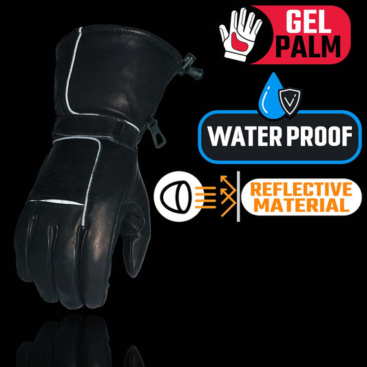 Milwaukee Leather Men's Black Soft Leather Gauntlet Motorcycle Hand Gloves-Waterproof Gel Palm Reflective Piping SH873