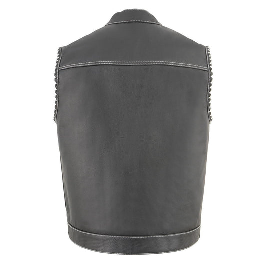 Milwaukee Leather MLM3525 Men's Black 'Paisley' Accented White Stitching Leather Vest – w/Armhole Trim Open Collar Design