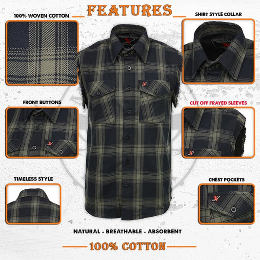 Milwaukee Leather MNG11691 Men’s Classic Black and Green Button-Down Flannel Cut Off Frayed Sleeveless Casual Shirt