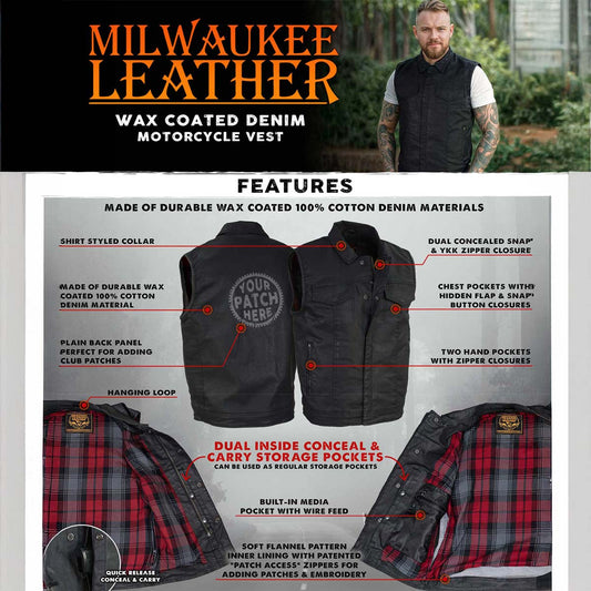 Milwaukee Leather MDM3030 Men’s Black Waxy Coated Denim Club Style Motorcycle Rider Vest w/ Shirt Collar