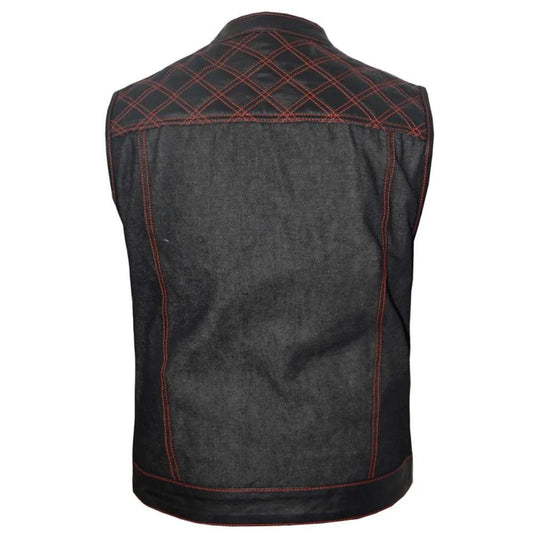 Club Vest CVM3038 Men's Black Denim Collarless Motorcycle Club Style Vest with Leather Trim