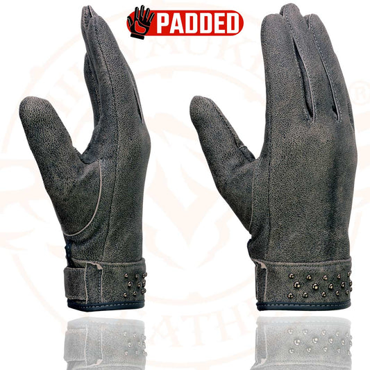 Milwaukee Leather MG7760 Women's Distressed Grey Leather Gel Palm Motorcycle Hand Gloves W/ Stylish ‘Wrist Detailing’
