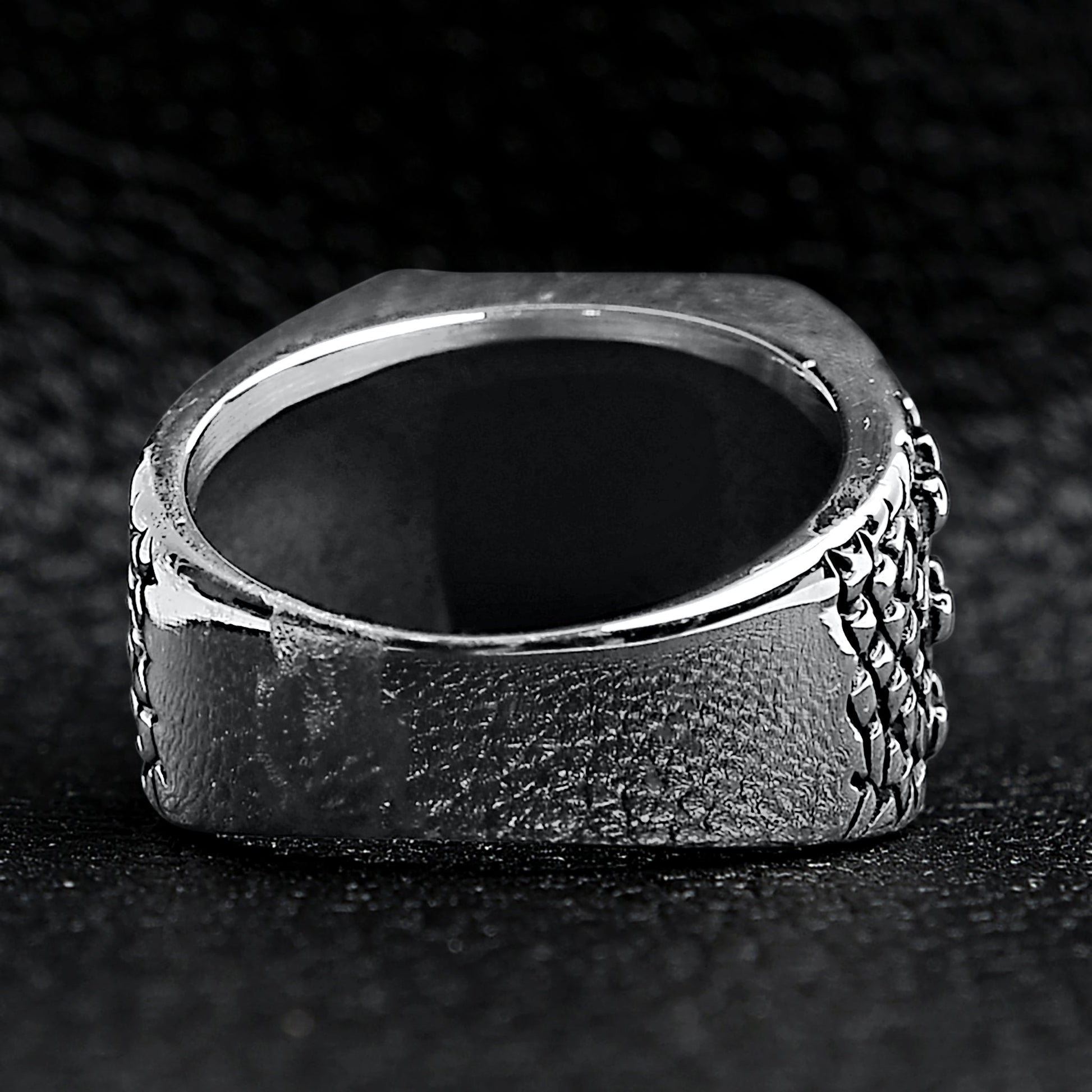 The Detailed Cubed Center Black Stone Stainless Steel Ring from our Heavy Metal Collection is custom molded and cast with a premium blend of surgical stainless steel that offers durability and comfort, even after every day wear. Combined with a polished finish and detailed accents including the large black stone, the Detailed Cubed Center Black Stone Stainless Steel Ring works great as a bold statement ring that can be worn in water or while you sweat without worry. If you're looking for a heavy metal or gothic style jewelry piece to stand out, the black stone ring is a solid choice!