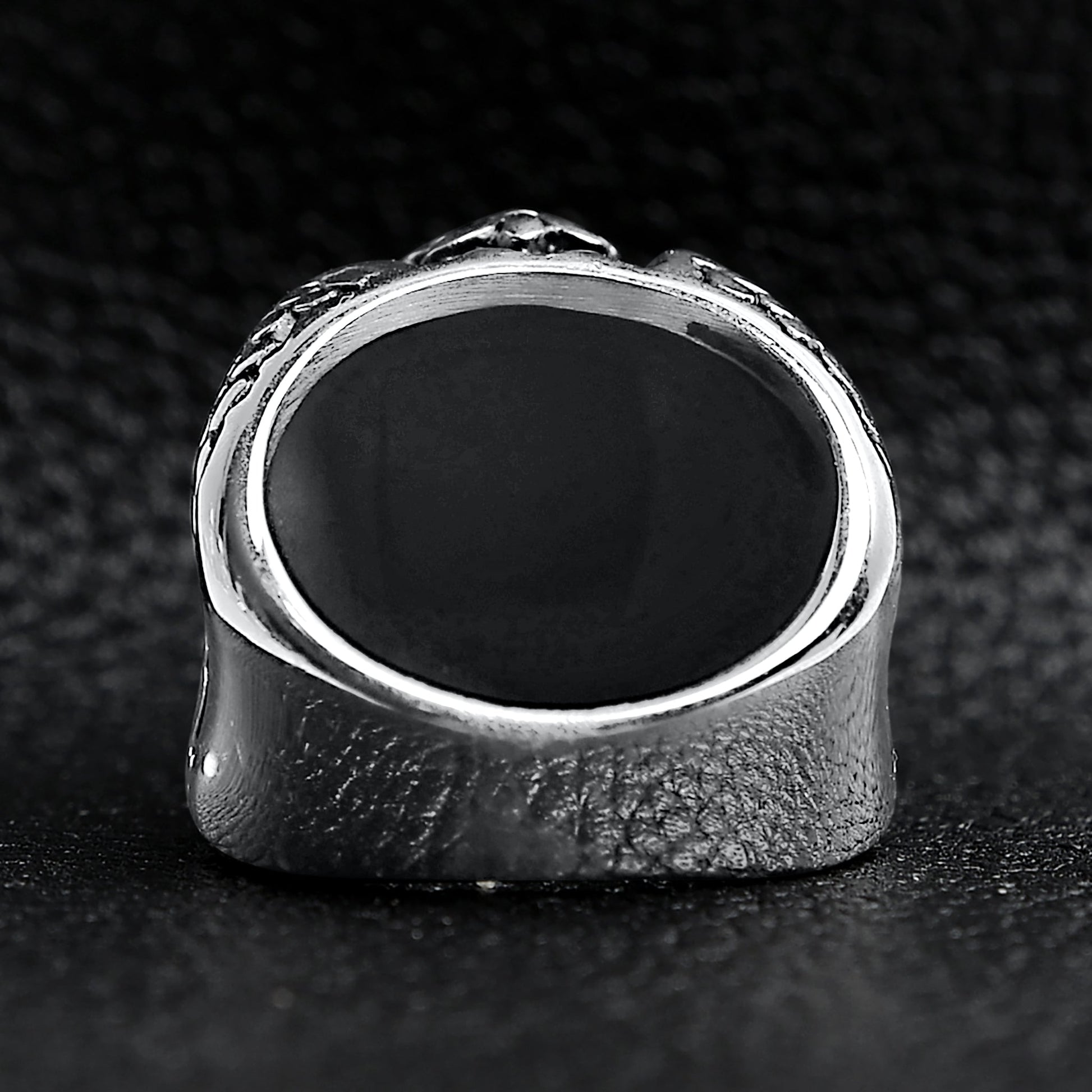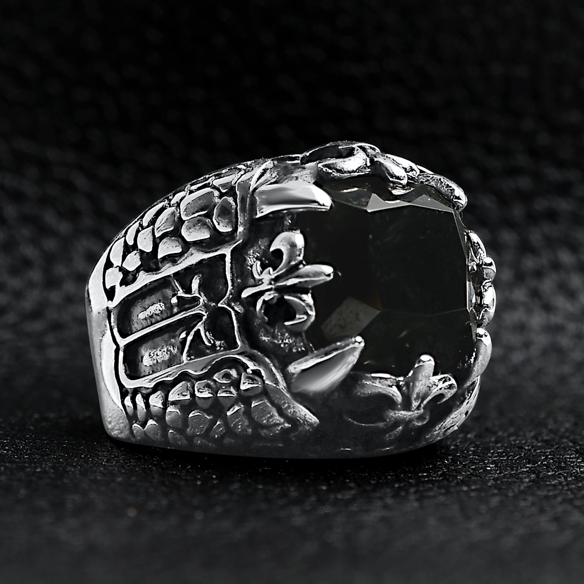 The Fleur De Lis Black Stone Ring from our Gothic Collection is custom molded and cast with a premium blend of surgical stainless steel that offers durability and comfort, even after every day wear. This unique gothic inspired ring features textured designs and detailed accents including the large black stone. The Fleur De Lis Black Stone Ring works great as a bold statement ring that can be worn in water or while you sweat without worry. If you're looking for a heavy metal or gothic style jewelry piece to stand out, this black stone ring is a solid choice!