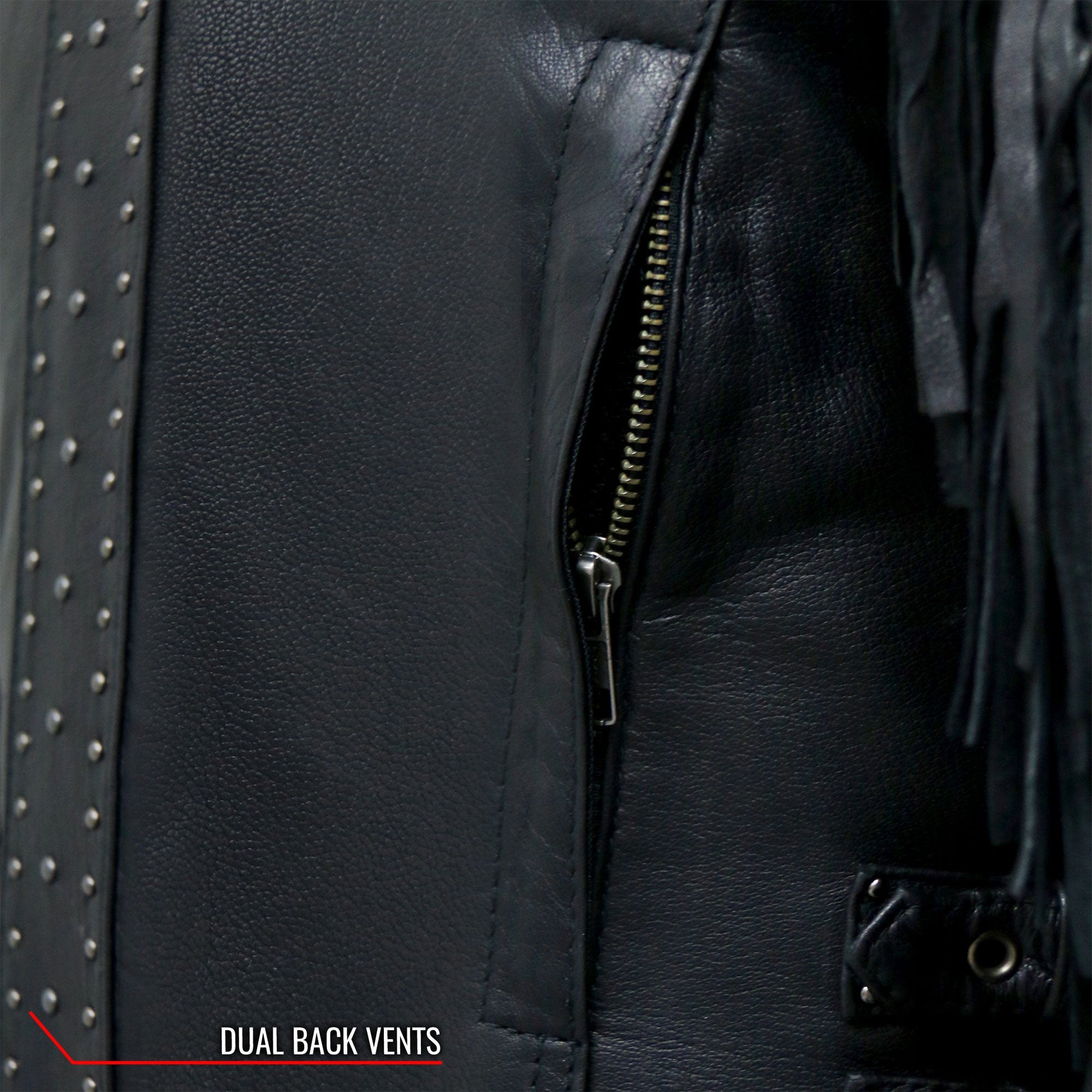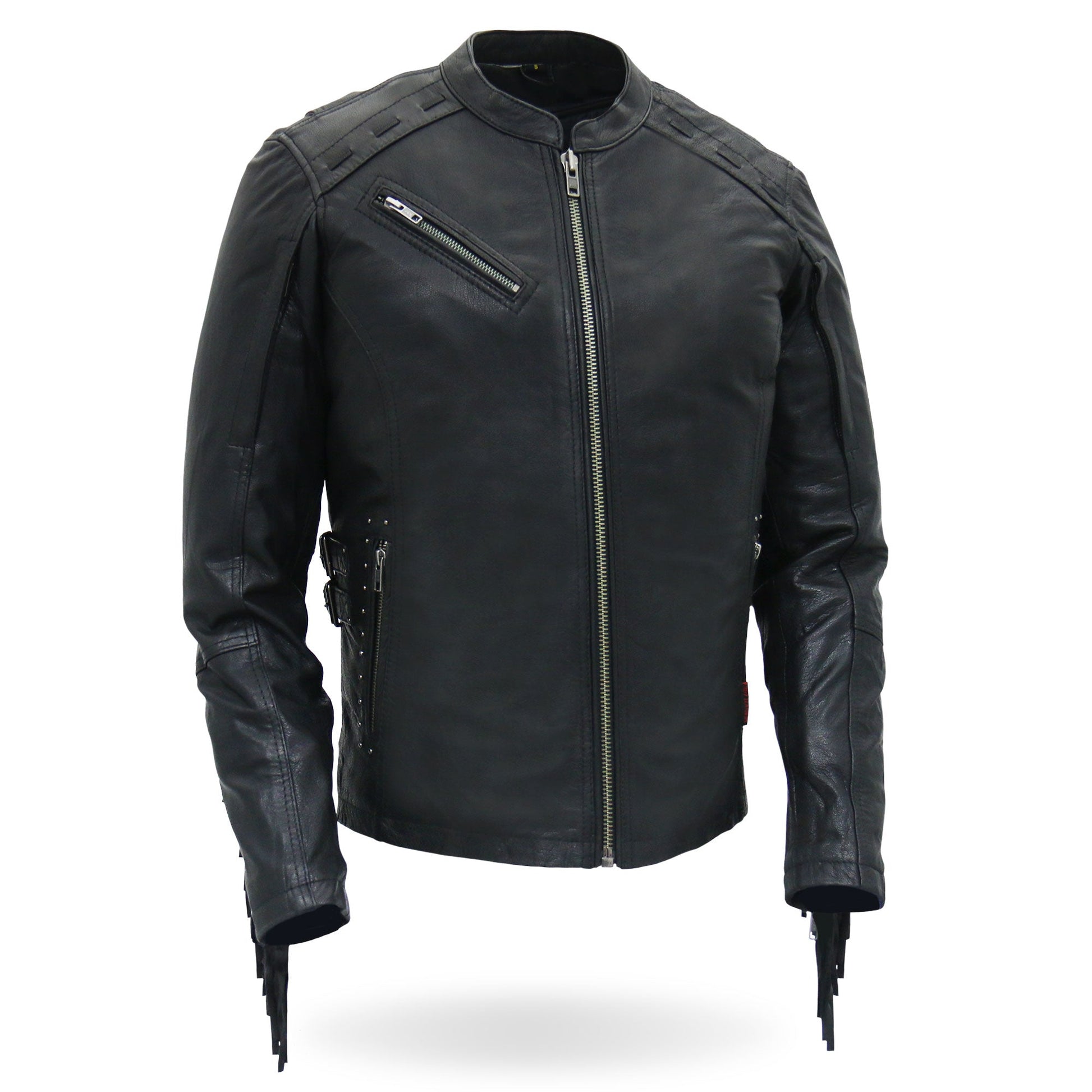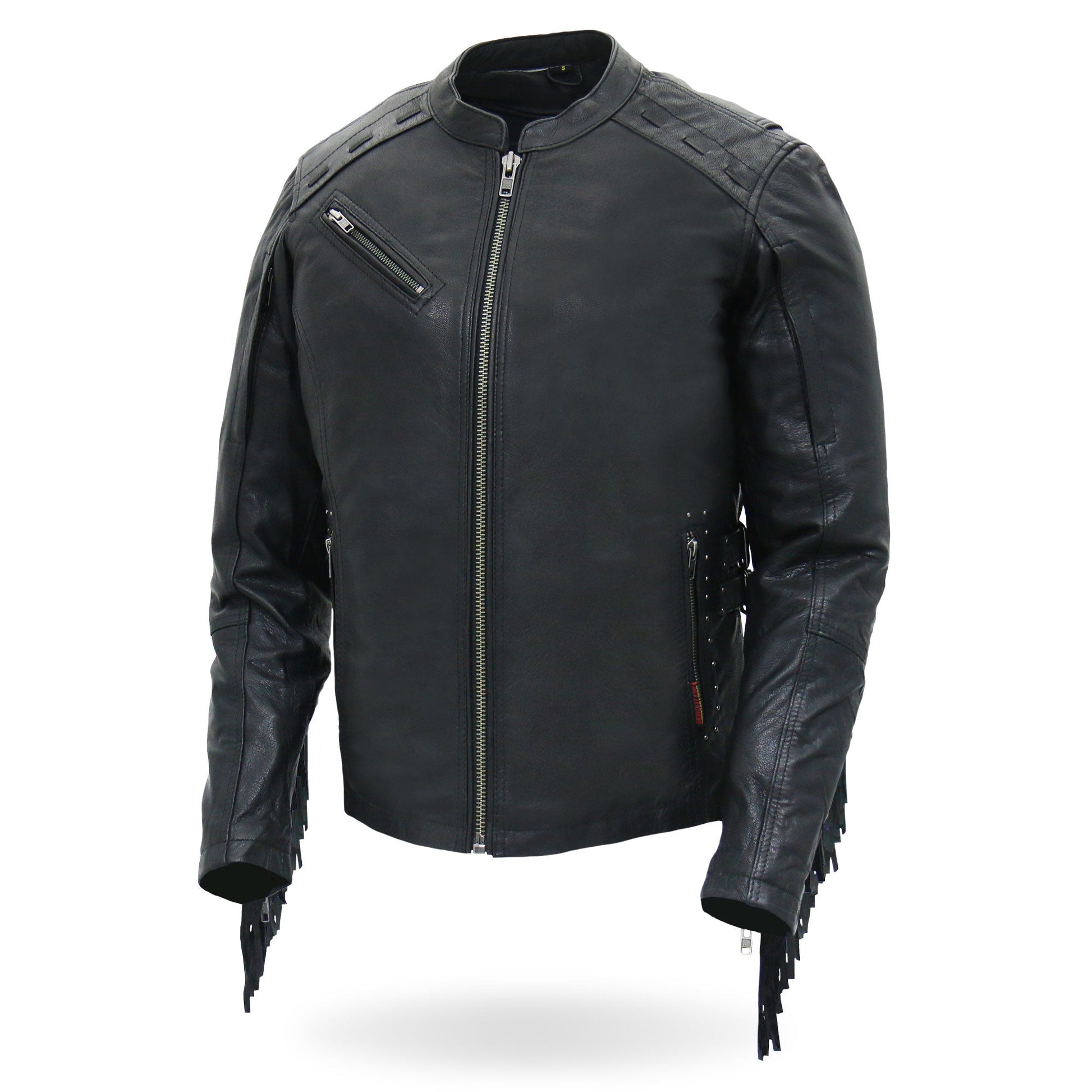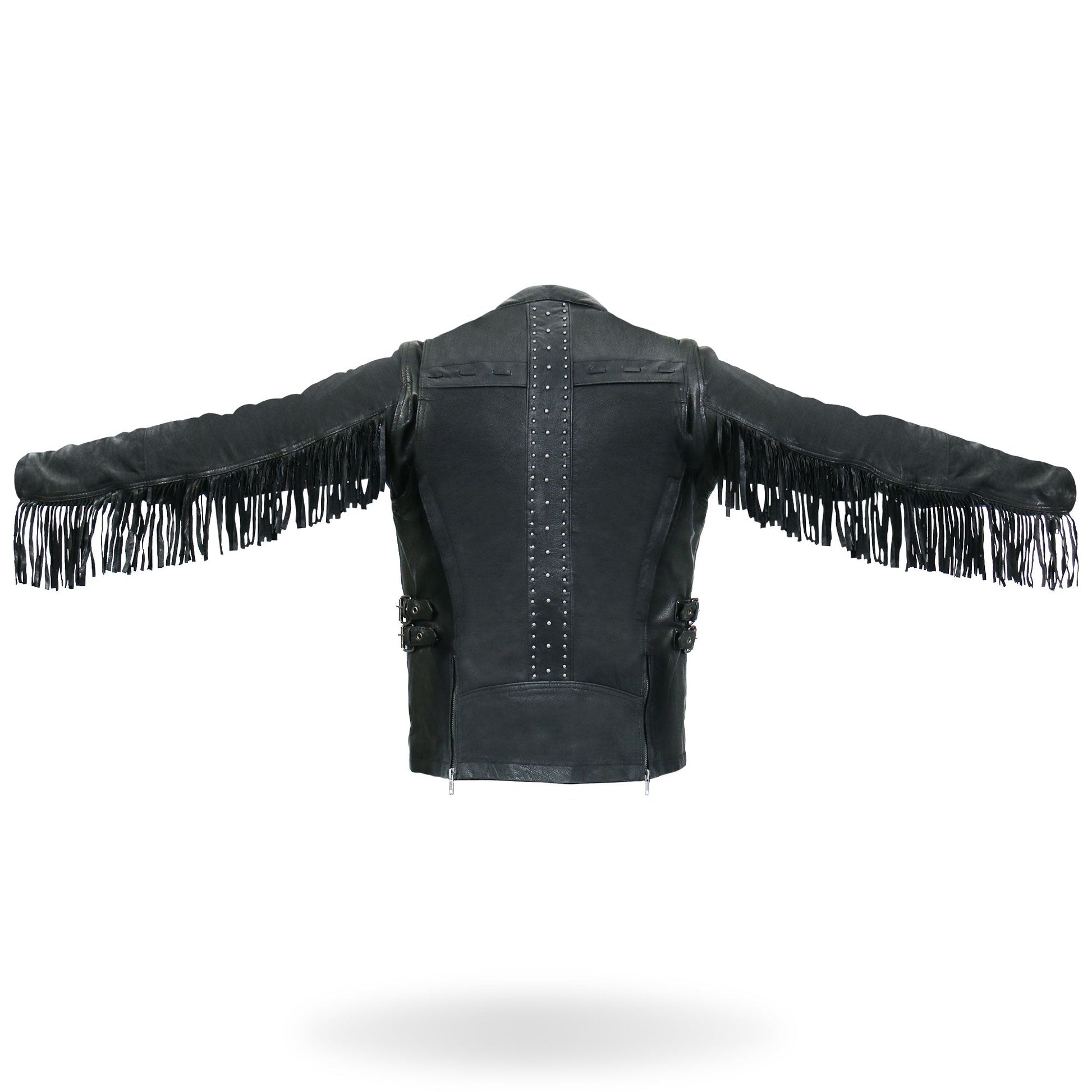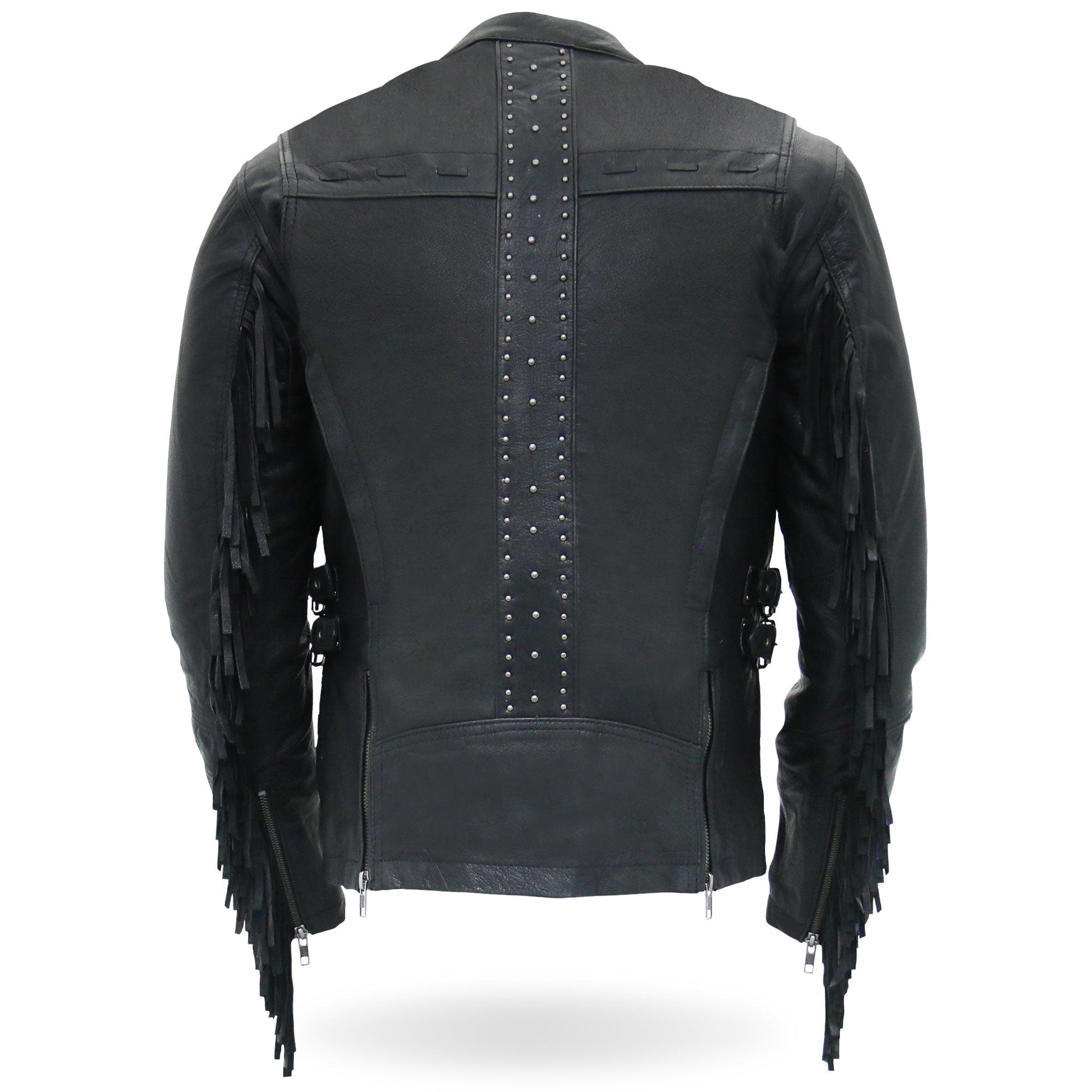 You asked for leather fringe and we listened. This all new Hot Leathers fringe motorcycle jacket is built using super soft medium weight cowhide and features silver YKK zippers and snaps. This jacket also comes with two under arm and two back vents, a great feature when you need that quick cool down while riding. The leather fringe on this jacket is the real standout feature and very eye catching. Another great detail is the triple row of silver studs going down the back. It also features two front zipper pockets, scooter style collar, two carry conceal inside pockets, adjustable buckle sides and a zip out quilted lining. A great new feature is lower back zipper panels, unzip these when on those long rides for more comfort.