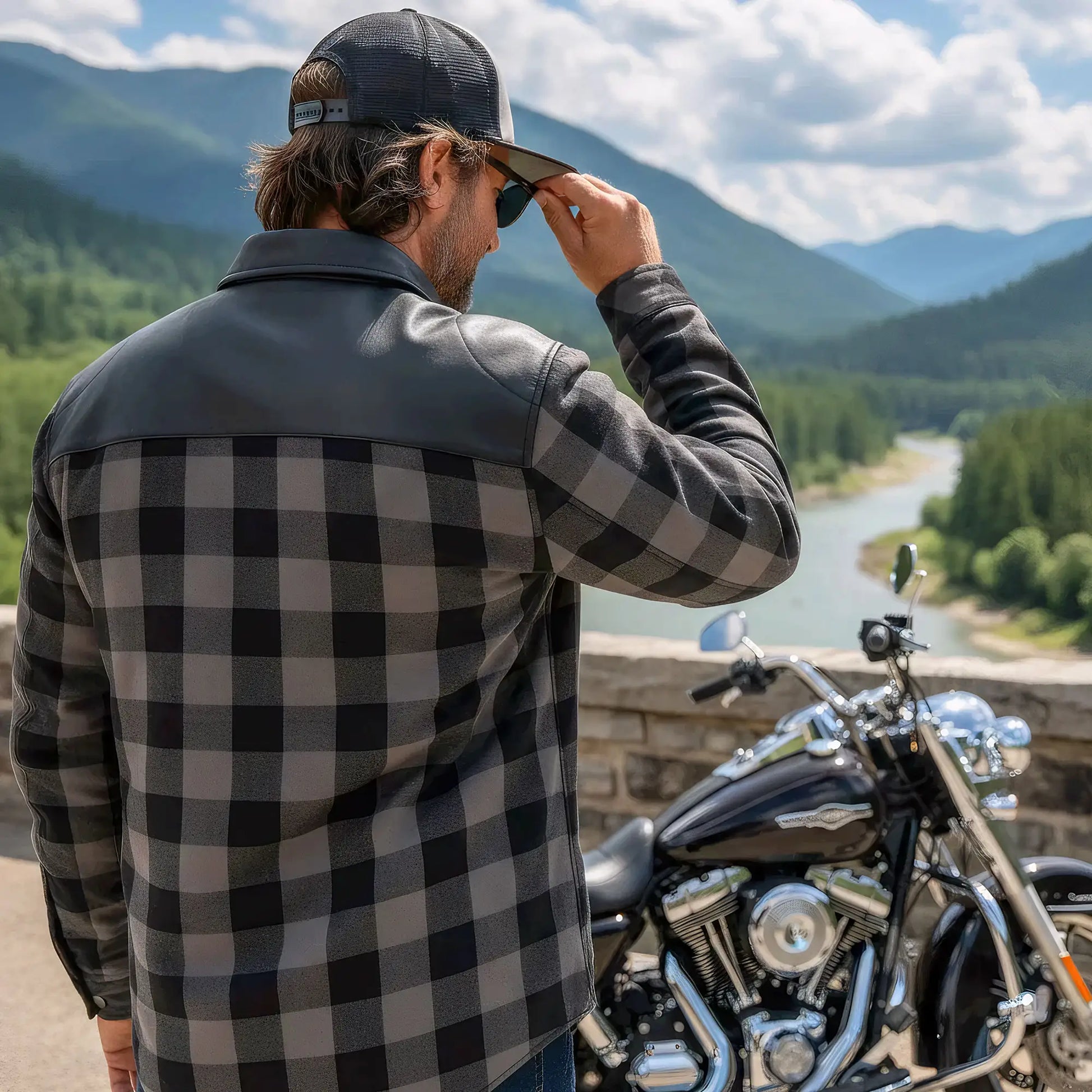 Hot Leathers JKM3203 Men's Motorcycle style Grey and Black Reinforced Leather and Plaid Flannel Biker Shirt