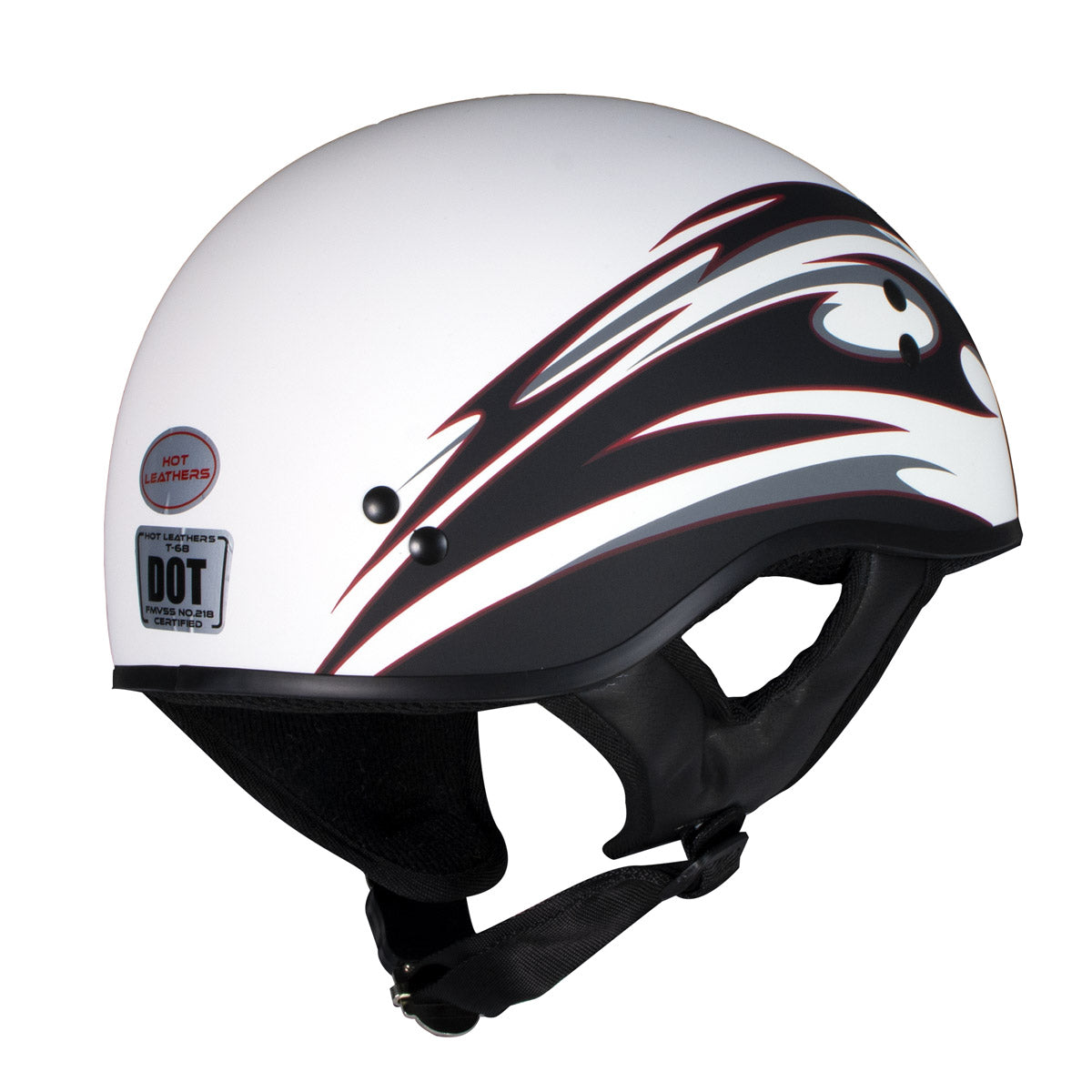 - DOT Approved: Glossy White Finish with Tribal Graphic half helmet with a composite shell is a type of protective gear that meets and exceeds the Department of Transportation FMVSS 218 safety standard. It’s made with strong light weight material. It’s designed to provide high level protection to the rider in the event of a crash. Our helmet’s also have a thick EPS (expanded polystyrene) inner lining for comfort and added protection.