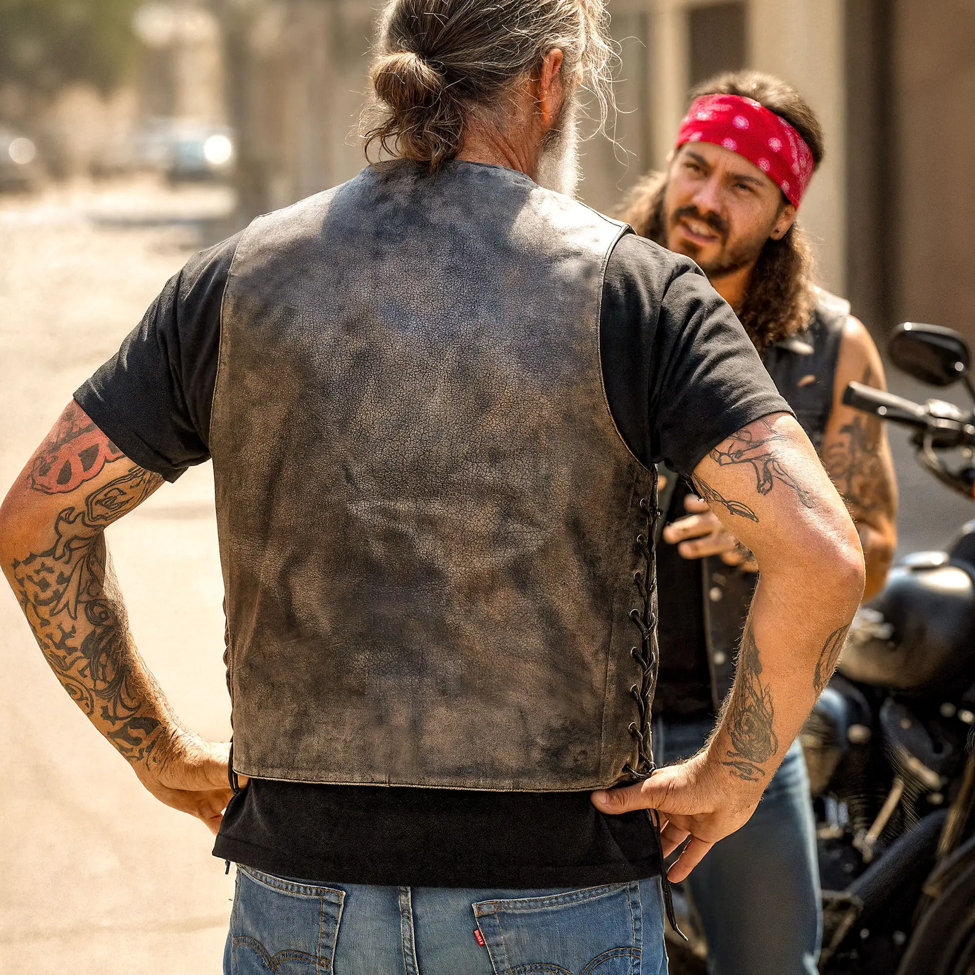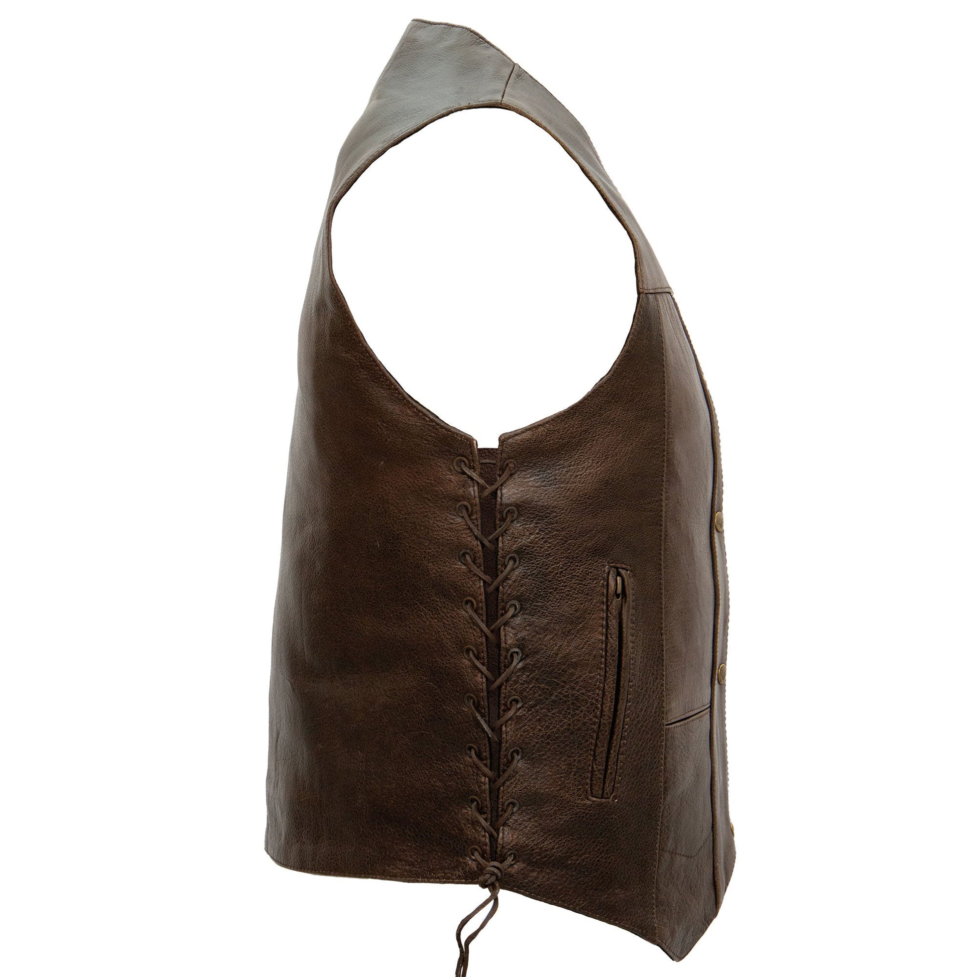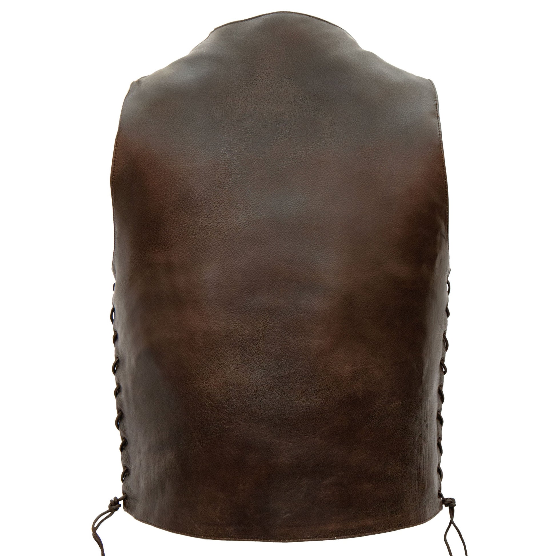A new vest from the Hot Leathers Heritage Collection. This Hot Leathers motorcycle vest is built using heavyweight distressed brown leather and antique brass YKK snaps. This leather vest features two outside zippered pockets and two stash pockets with two extra deep carry conceal inside pockets and two inside stash pockets. A total of eight pockets on this vest gives you a ton of storage options. This leather vest also features lace up sides and a nylon mesh lining. The leather is super soft for that already broken in feel.
