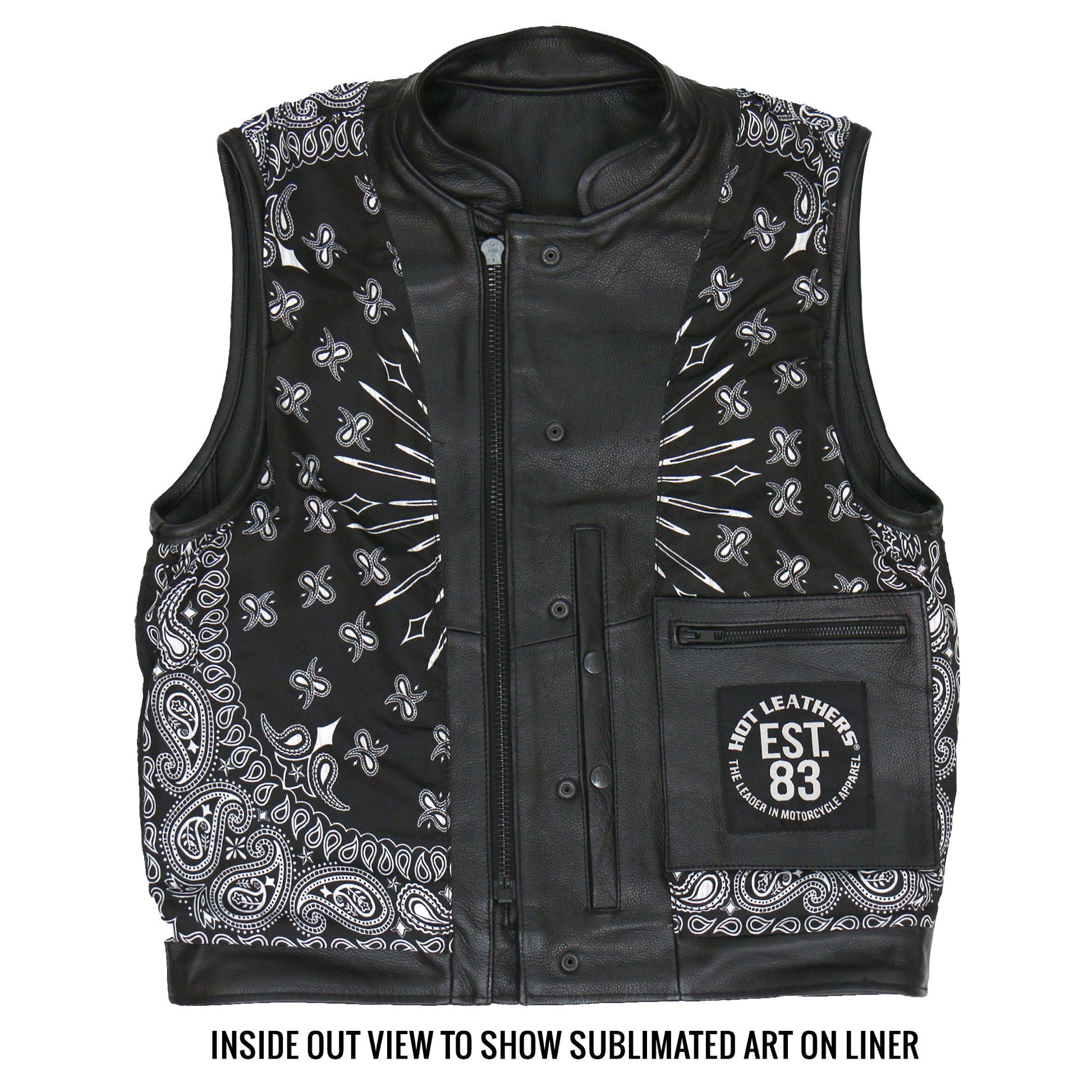 Hot Leathers is proud to announce of new collection of leather riding vests with full graphic printed lining. This Hot Leathers motorcycle club style vest is built using heavyweight cowhide, has a full zippered front and black YKK hidden snaps. This vest features a multi color polyester printed lining using the art from our classic green paisley design. This vest features four outside pockets, two carry conceal pockets and one zippered media pocket. 7 pockets! It features a one piece back with no seams which is great for stitching large patches on.