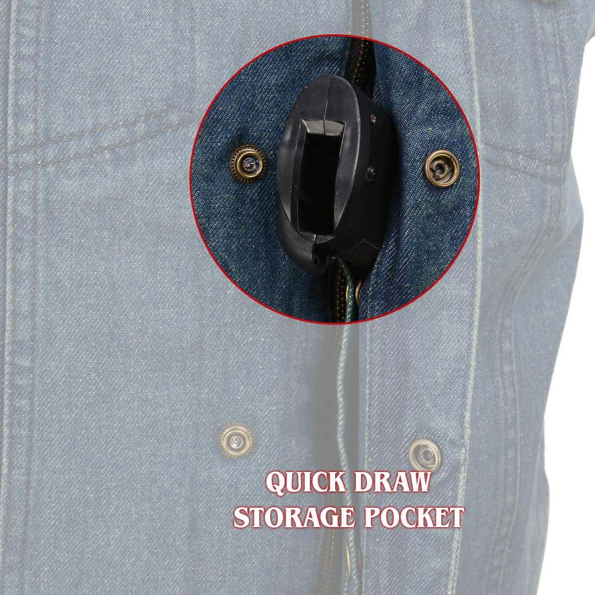 - Quick Draw Concealed Carry Functionality | This denim biker vest for men is designed with concealed carry dual storage pocket (can be used as a regular storage pockets) and a quick draw feature. It features strategically placed pockets with secure closures, allowing you to discreetly carry your protection while maintaining a sleek and stylish look. Our jean vest for men features 2 front chests flap conceal carry and 2 outside lower drop storage pockets, allowing you to securely store and easily access small items such as keys, wallets.