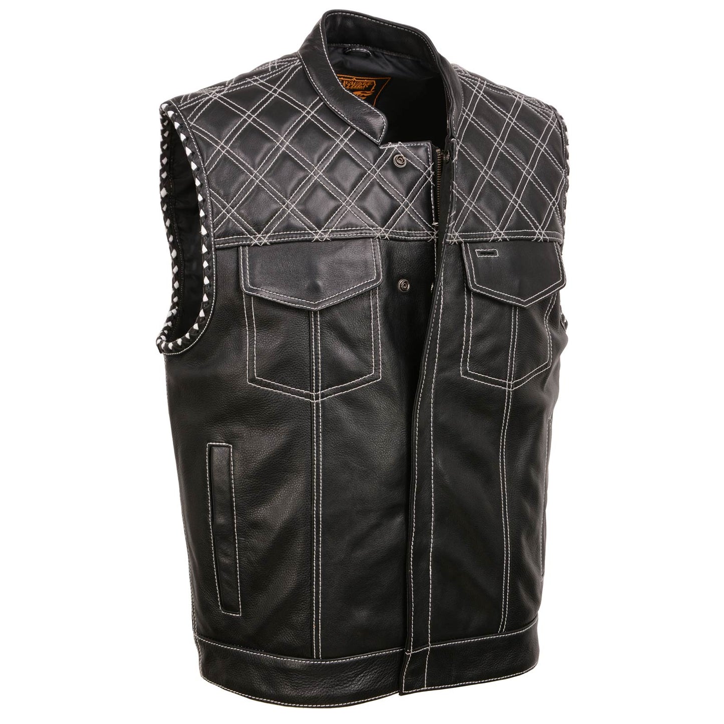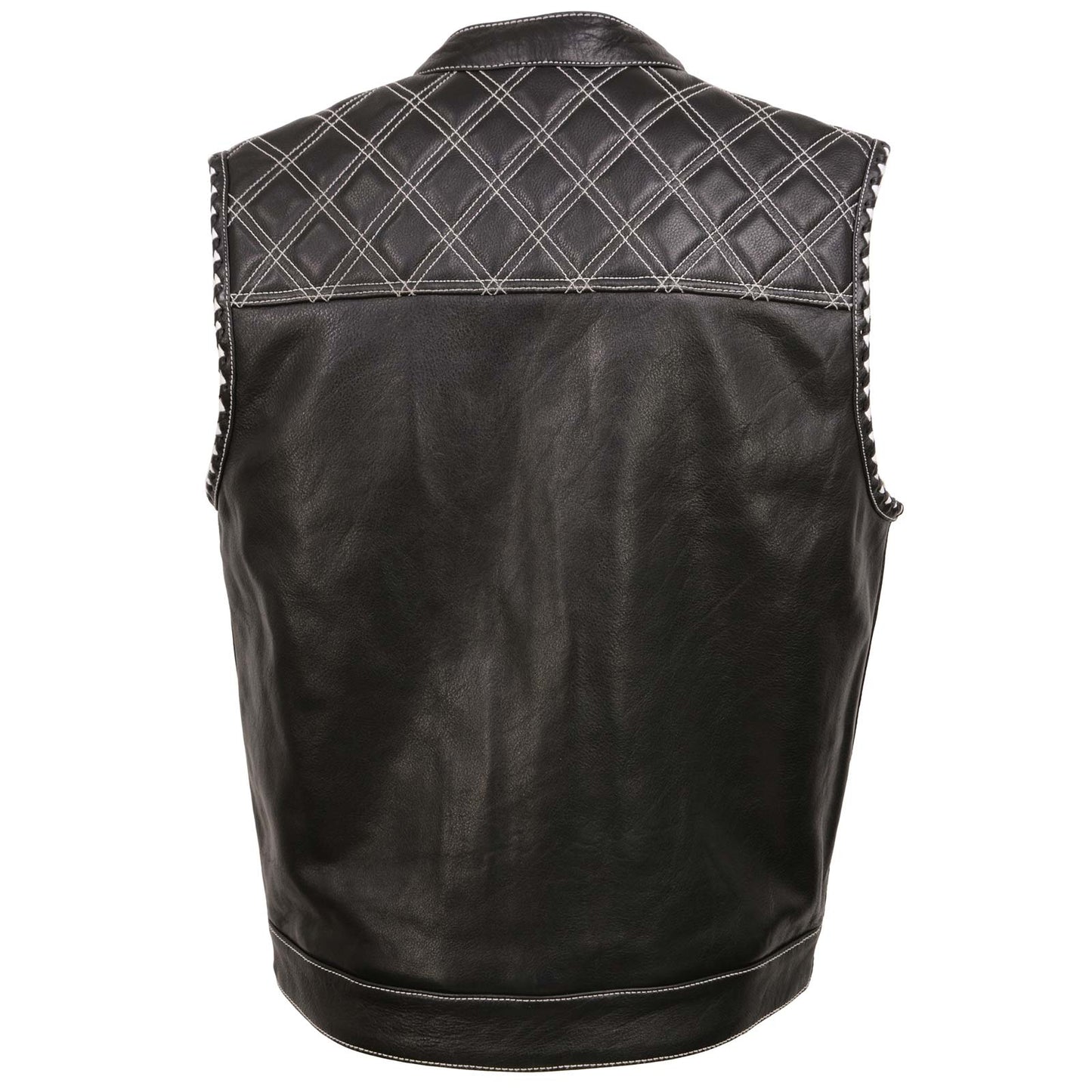 Milwaukee Leather MLM3525 Men's Black 'Paisley' Accented White Stitching Leather Vest – w/Armhole Trim Open Collar Design