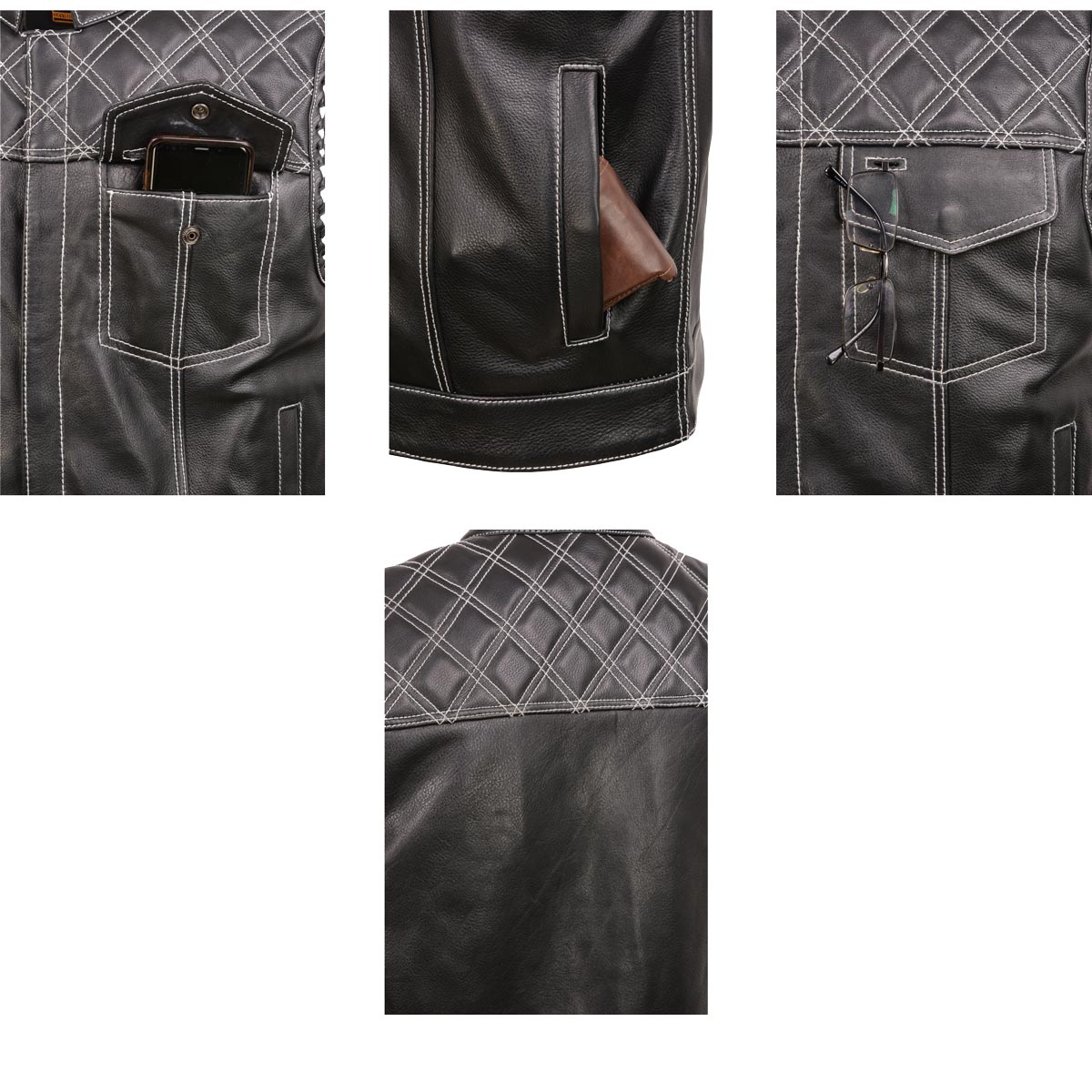 Crisp white contrast stitching and matching leather armhole trim give this black vest a clean, custom look that reads sharp in the daytime and under night lights.