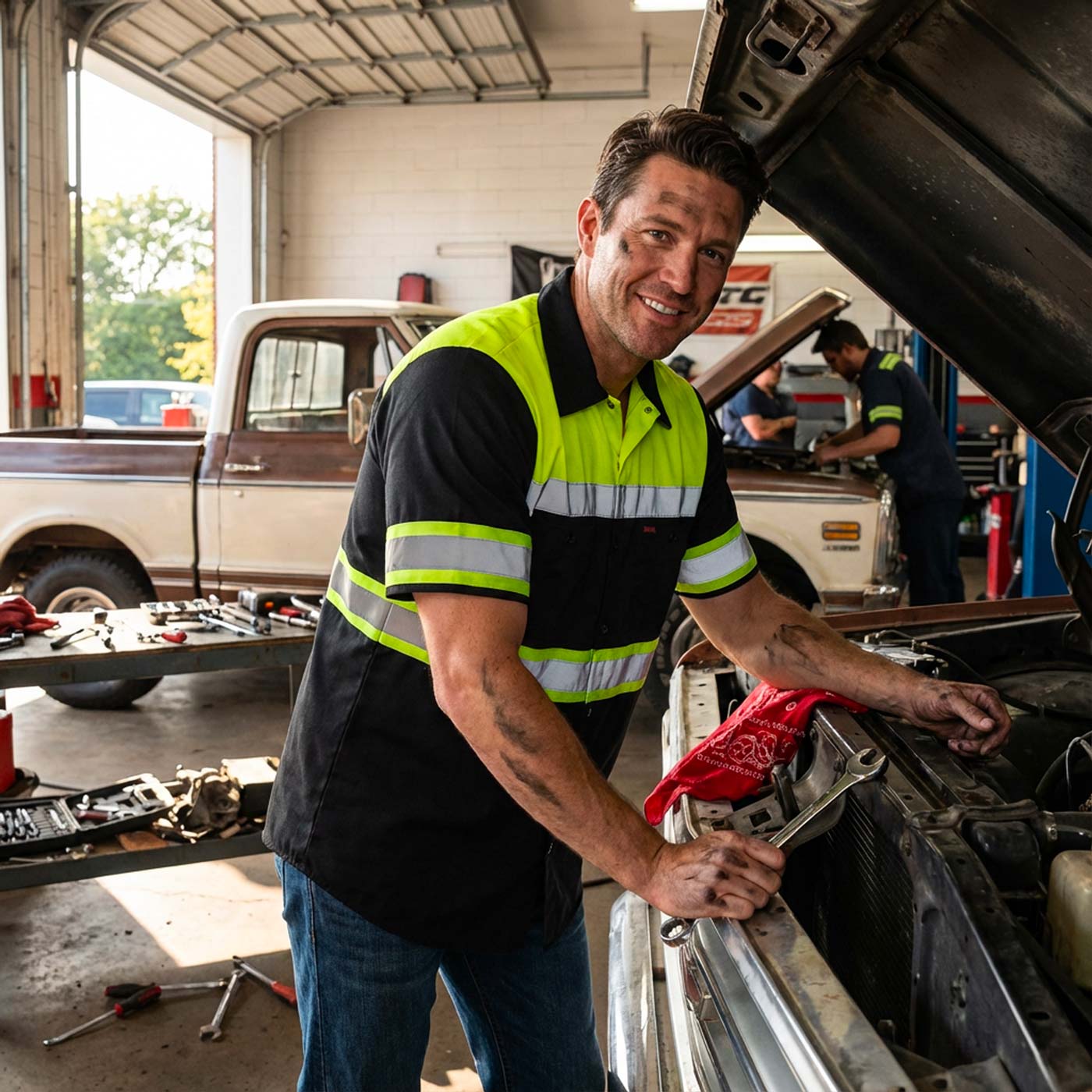 - Mechanic‑grade 50/50 cotton‑poly blend (durable, breathable)