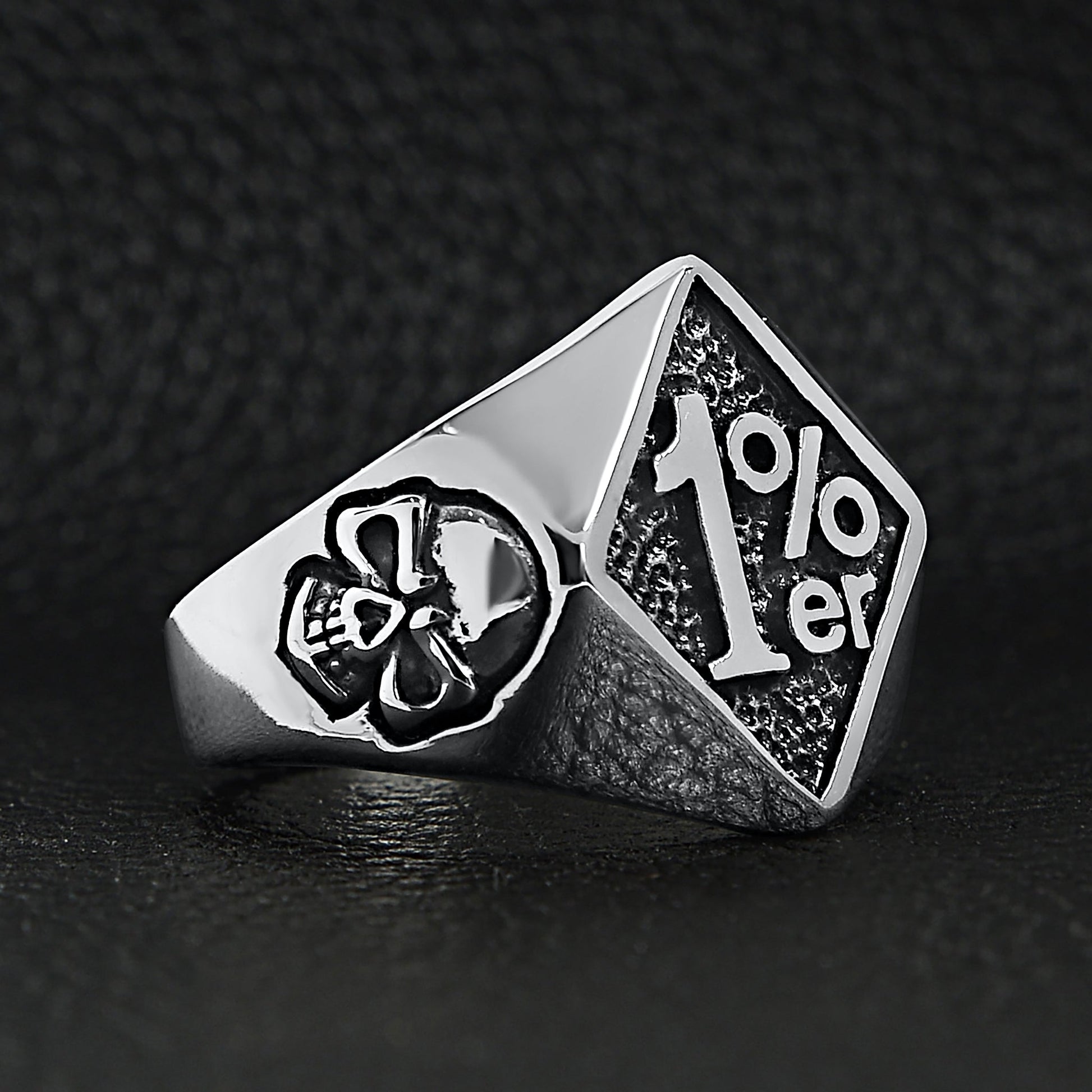 The Stainless Steel "1%er" With Skull Accents Signet Ring from our Biker Collection is custom molded and cast with a premium blend of surgical stainless steel that offers enhanced durability, even after exhaustive wear. Combined with a clean polished finish, the Stainless Steel "1%er" With Skull Accents Signet Ring works great as an everyday statement ring that can be worn in water or while you sweat without worry.