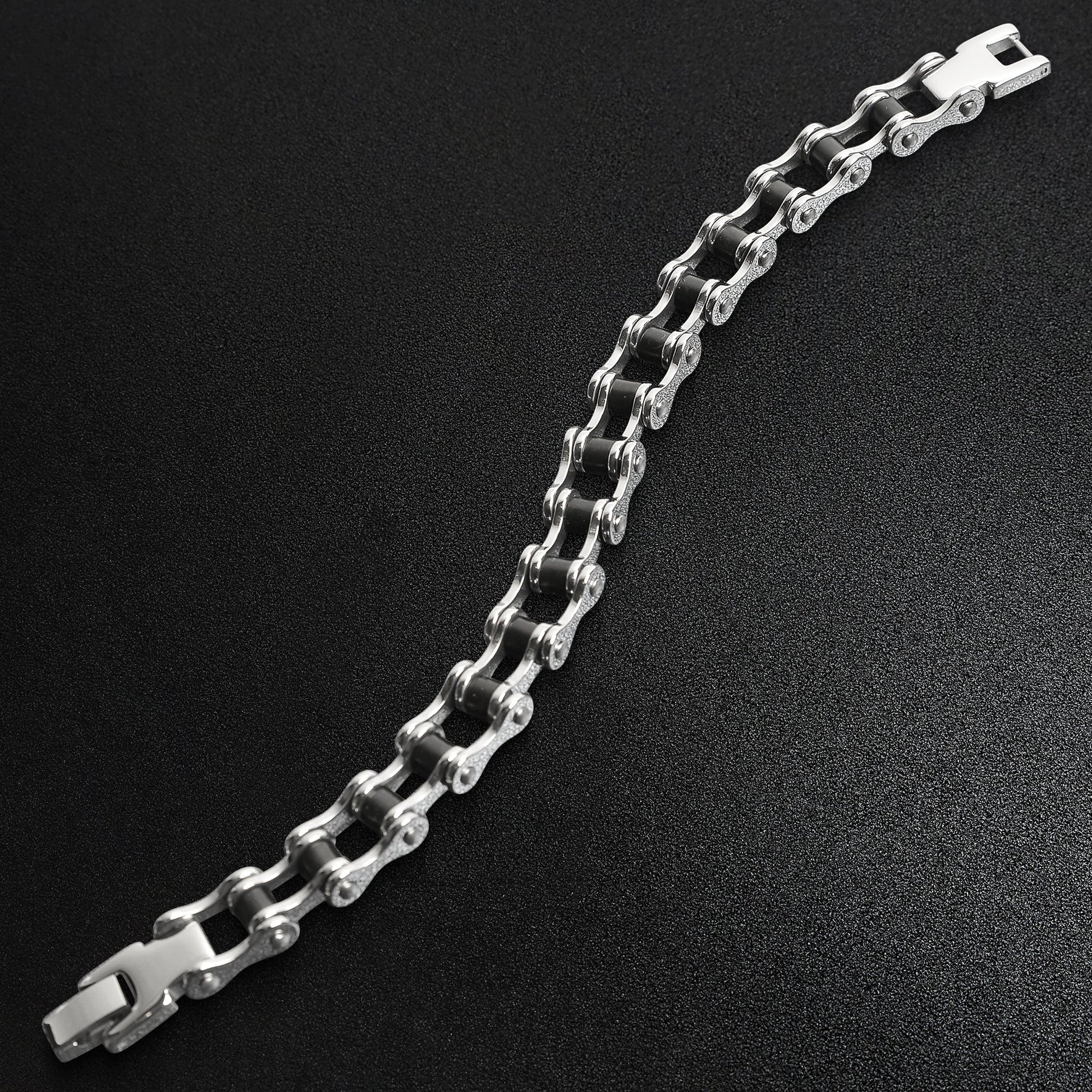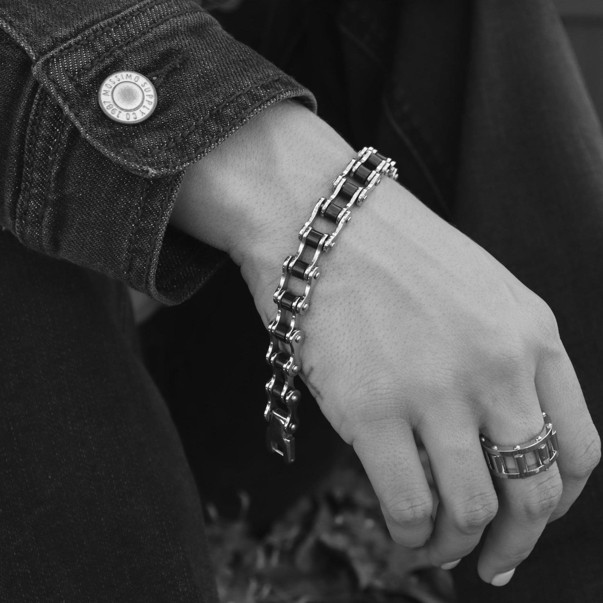 The Stainless Steel And Black Bike Chain Bracelet from our Biker Collection is made of premium stainless steel that offers enhanced durability, even after exhaustive every day wear on the road. The unique motorcycle bike chain bracelet design combined with a polished silver and black finish makes the silver and black bike chain bracelet the perfect accent for every day outfits and more. This Silver and Black Bike Chain Bracelet features a slim chain width that looks great on both Men and Women. Wear your new Stainless Steel And Black Bike Chain Bracelet without worry in the water or while you sweat, all jewelry from Biker Jewelry Shop is made to last!