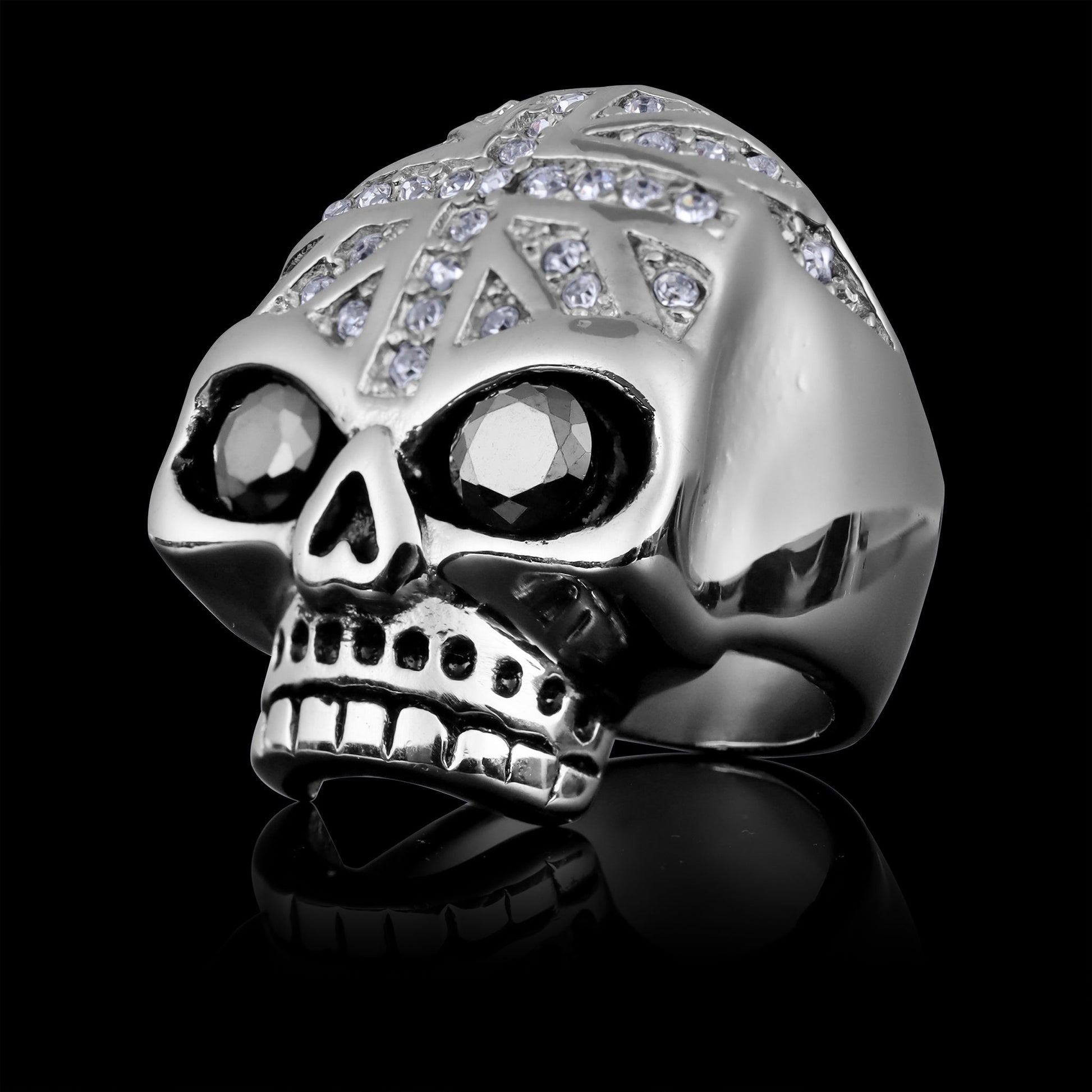Description: Stainless steel black Cubic Zirconia eyed skull with clear Cubic Zirconia UK flag ring.