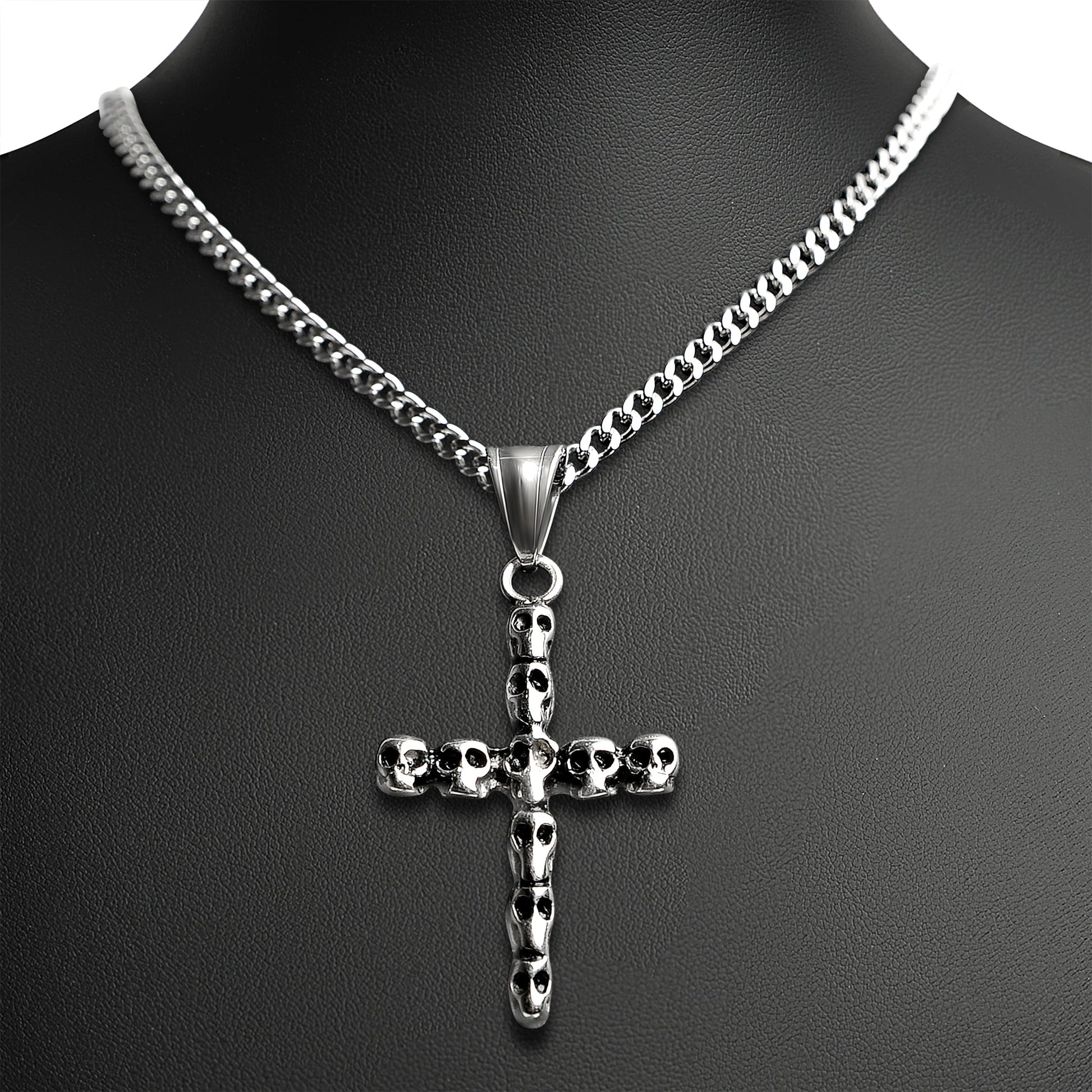 Description: Stainless Steel Cross Of Skulls Curb Chain Necklace