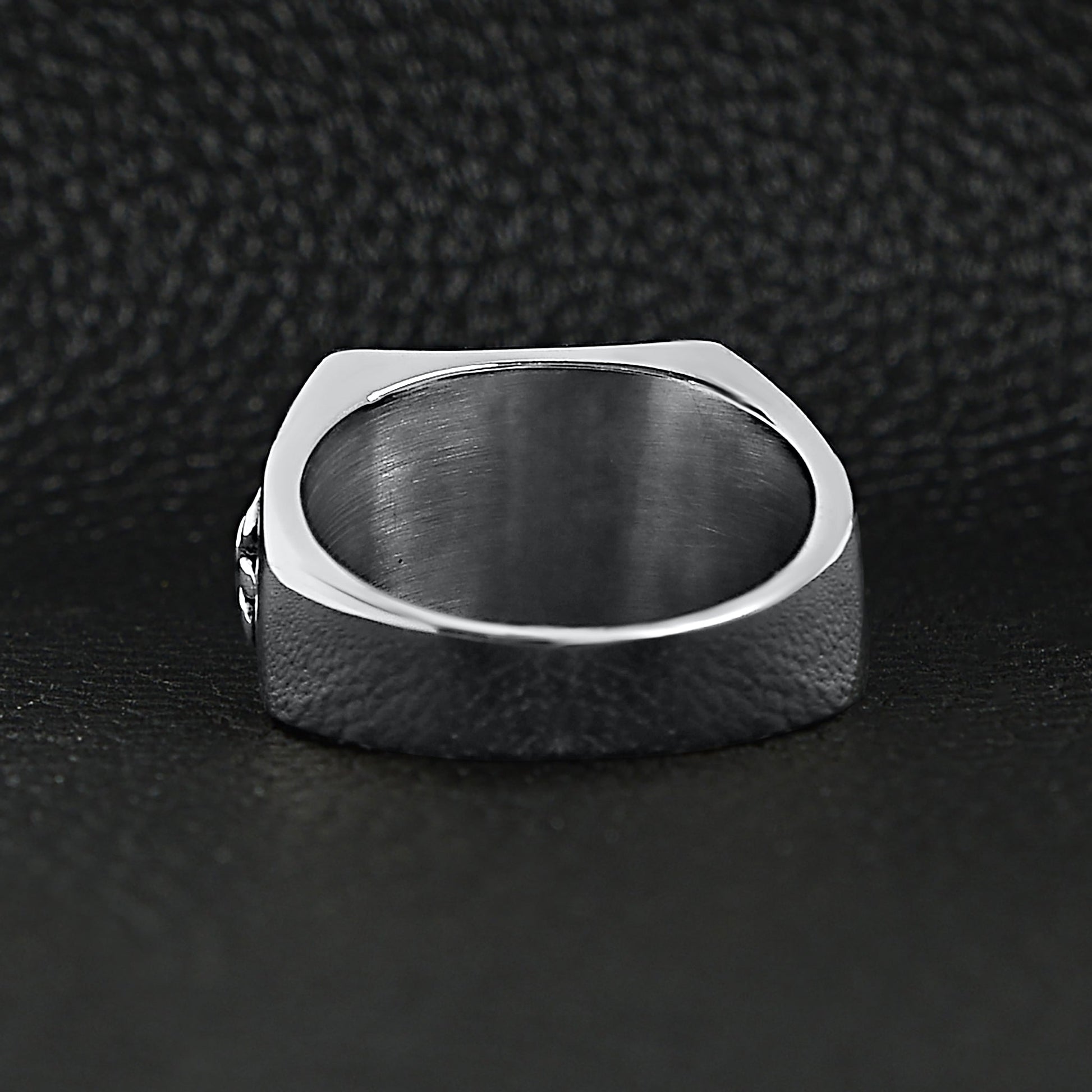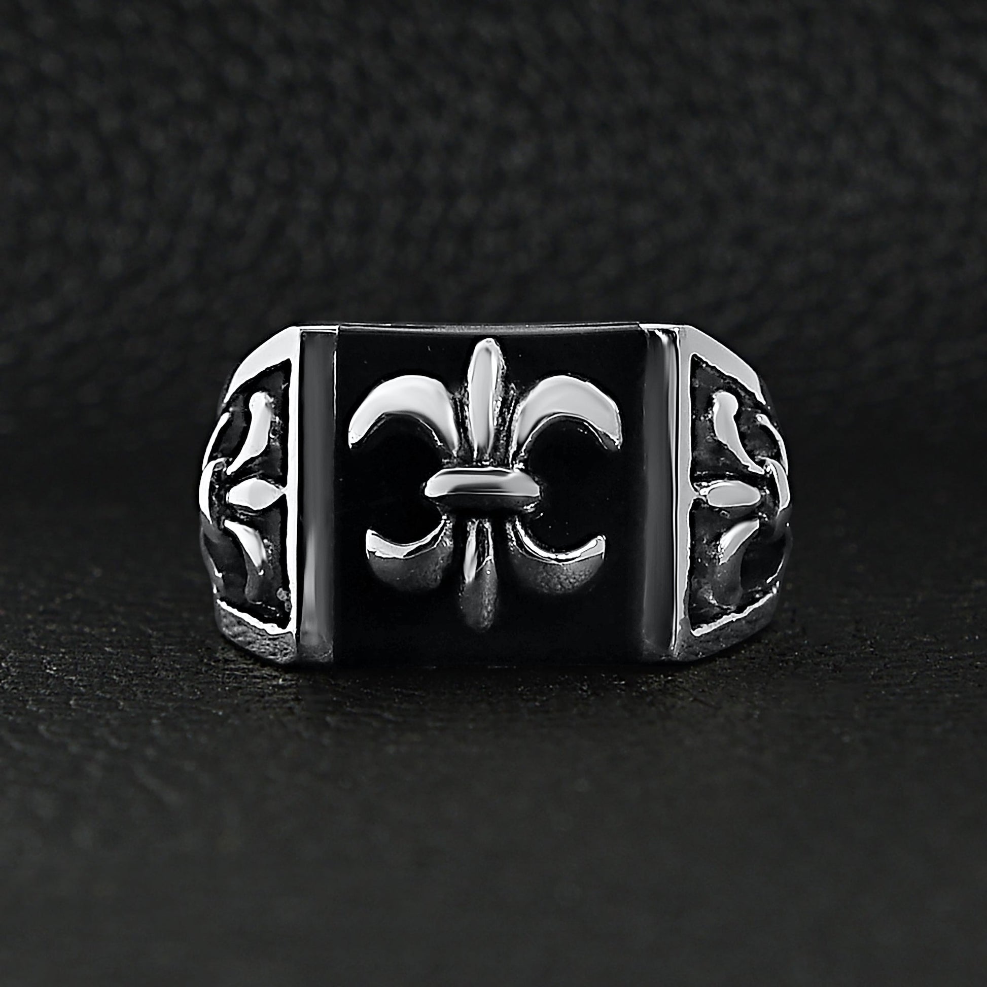 Description: Stainless steel polished black Fleur De Lis signet ring.