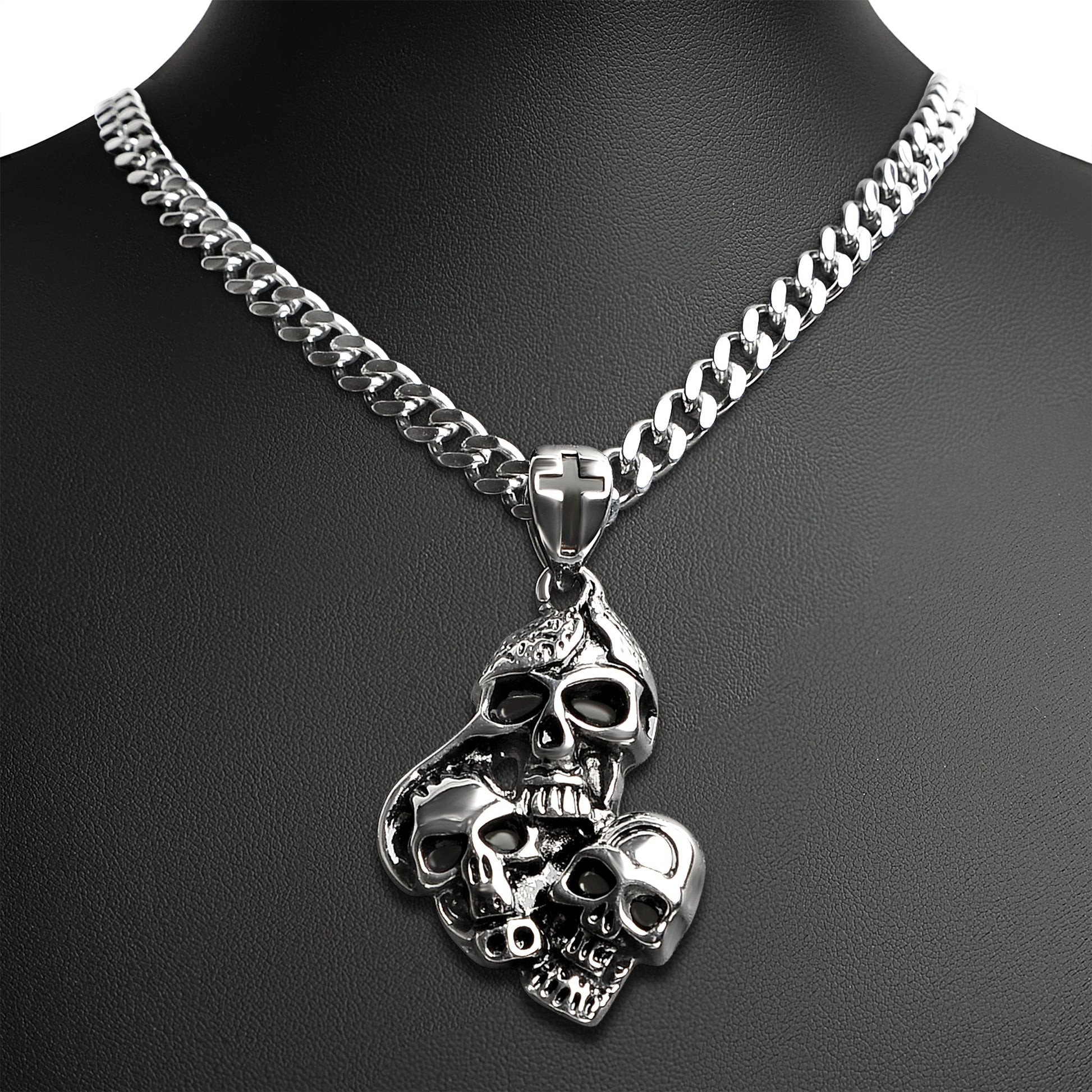 Description: Stainless Steel Three Skulls With Black Cross Curb Chain Necklace