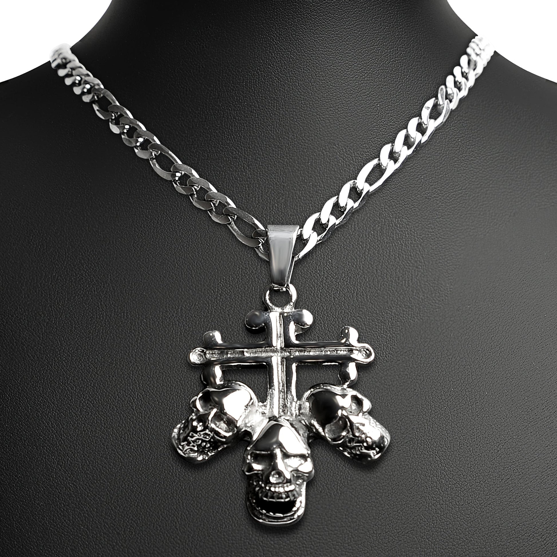 Stainless Steel Triple Skulls On Cross Figaro Chain Necklace