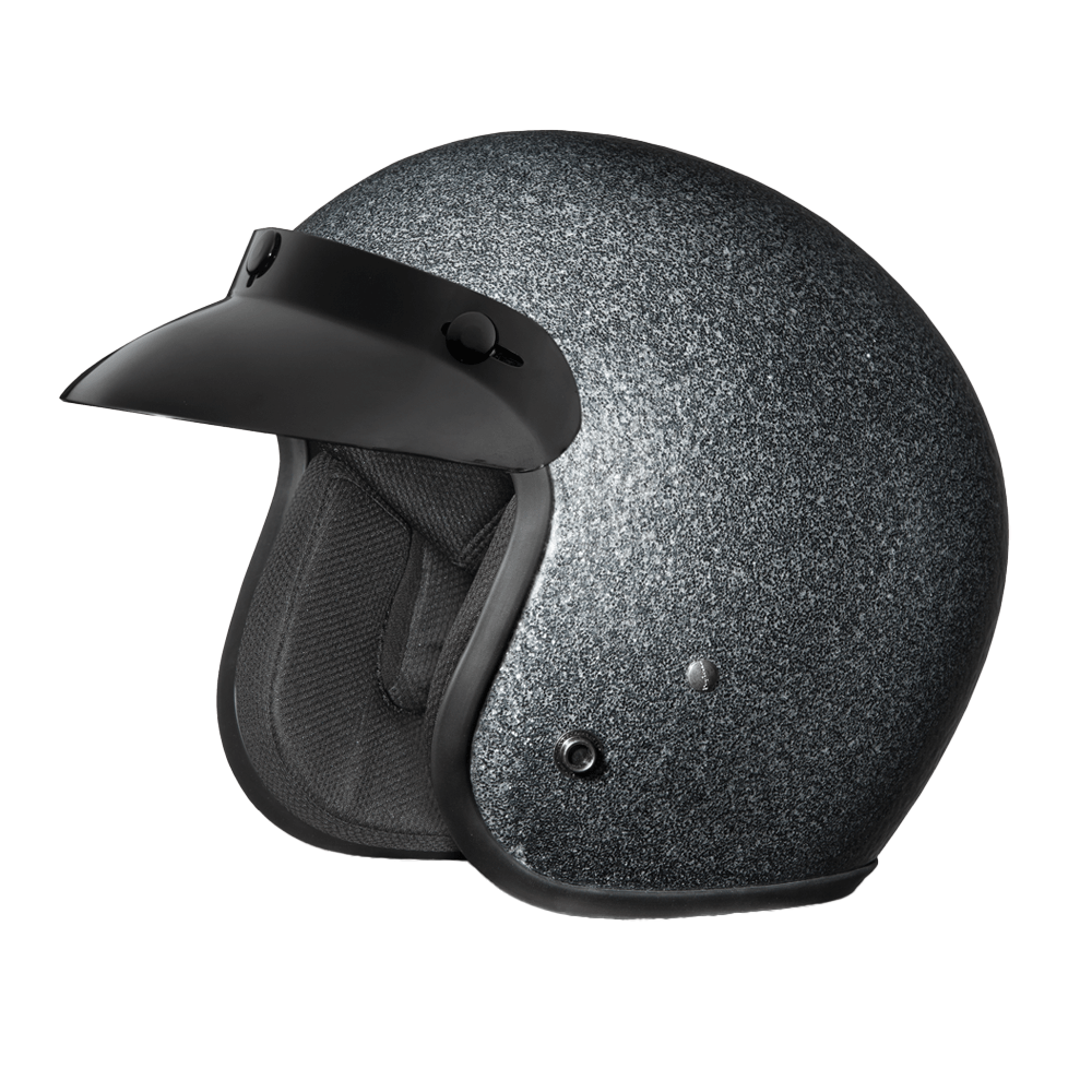 Our D.O.T. Daytona Cruiser 3/4 Shell Helmet In The Gun Metal Flake, Meets And Exceeds D.O.T. FMVSS 218 Standards And Is The Smallest D.O.T. 3/4 Shell Helmet Ever Made!!  With 3 Different Shell Sizes, You're Sure To Get That Proportionate Fit!!  Available Only With Removable, Snap On Gloss Black Bubble Visor.  Many More Colors And Designs Available Such As Soft Touch Dull Black, Hi-Gloss Black And Hi-Gloss White; Custom Colors: Gun Metal Grey Metallic; Specialty Items: Graphics.  Head Wrap And Cloth Draw String Bag Included.  Sizes Range From XS-2XL.