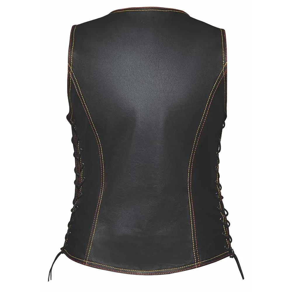 The Ladies PREMIUM vest in soft lightweight goatskin leather by Unik Premium features a red and gold paisley liner, two exterior zippered pockets, two interior concealed carry pockets, a flattering fit with side laces, silver hardware, and is available in sizes XS to 5XL.