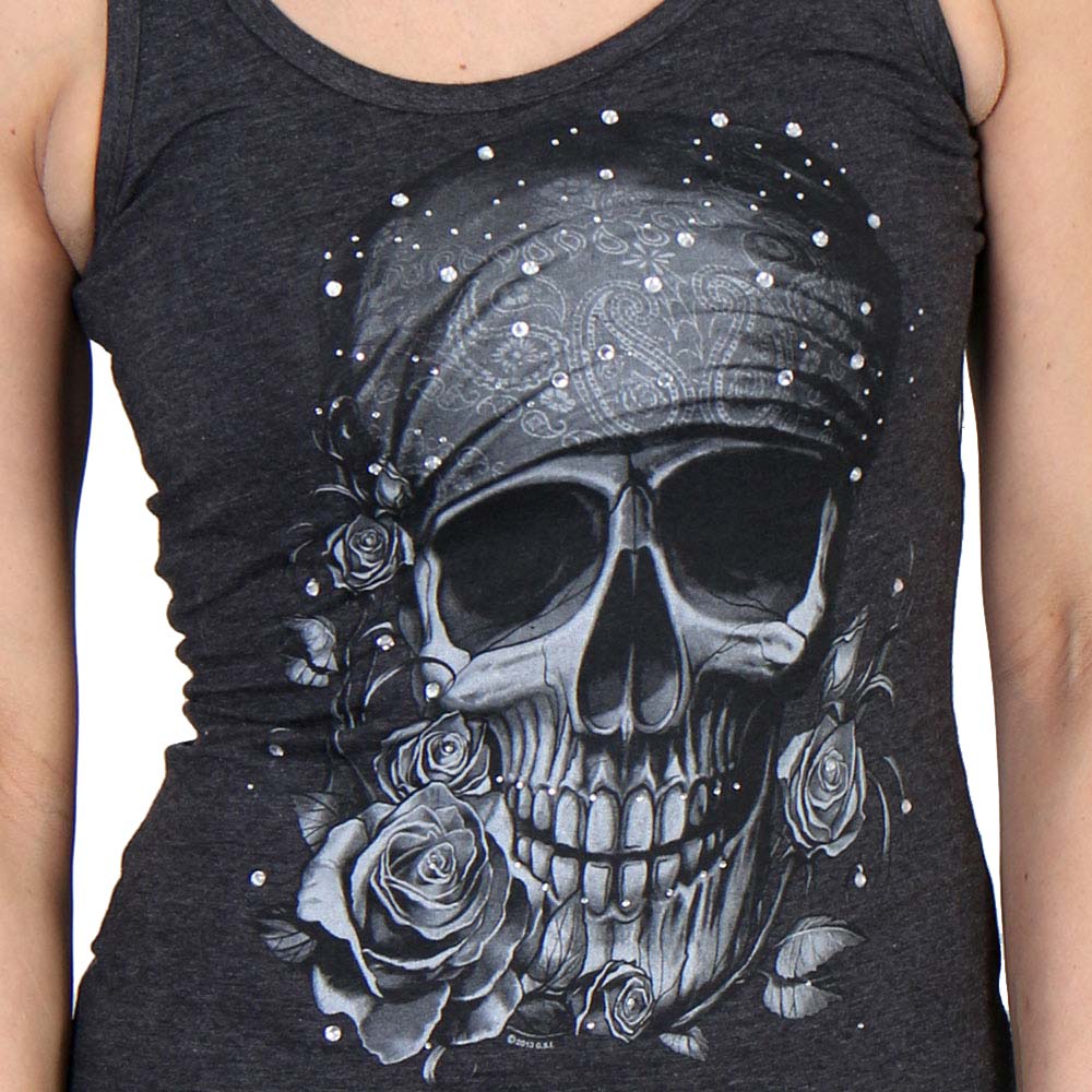 This form fitting tank in color heather charcoal with thick straps features a screen printed image of our highly detailed bandana skull ladies Design and has rhinestones located throughout.