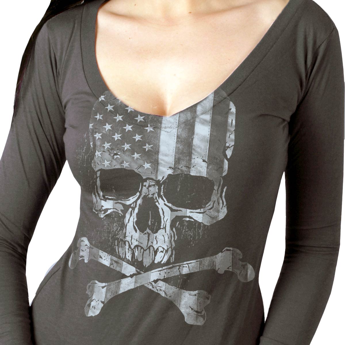 This ladies deep v long sleeved shirt in the color smoke features a screen printed image of a faded flag skull and crossbones.