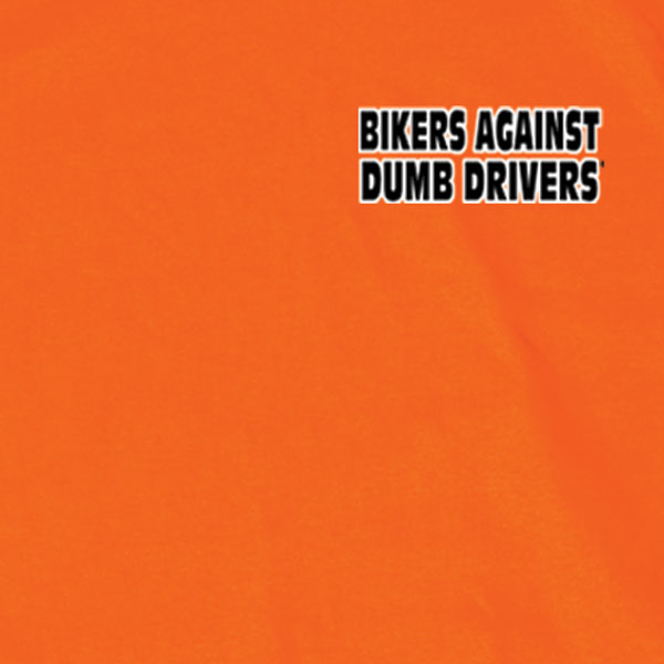 This Hot Leathers exclusive men's printed t-shirt comes in the color Safety Orange and reads "Bikers Against Dumb Drivers" on the left side on the front and "Can You See Me Now"? in large black print on the back.