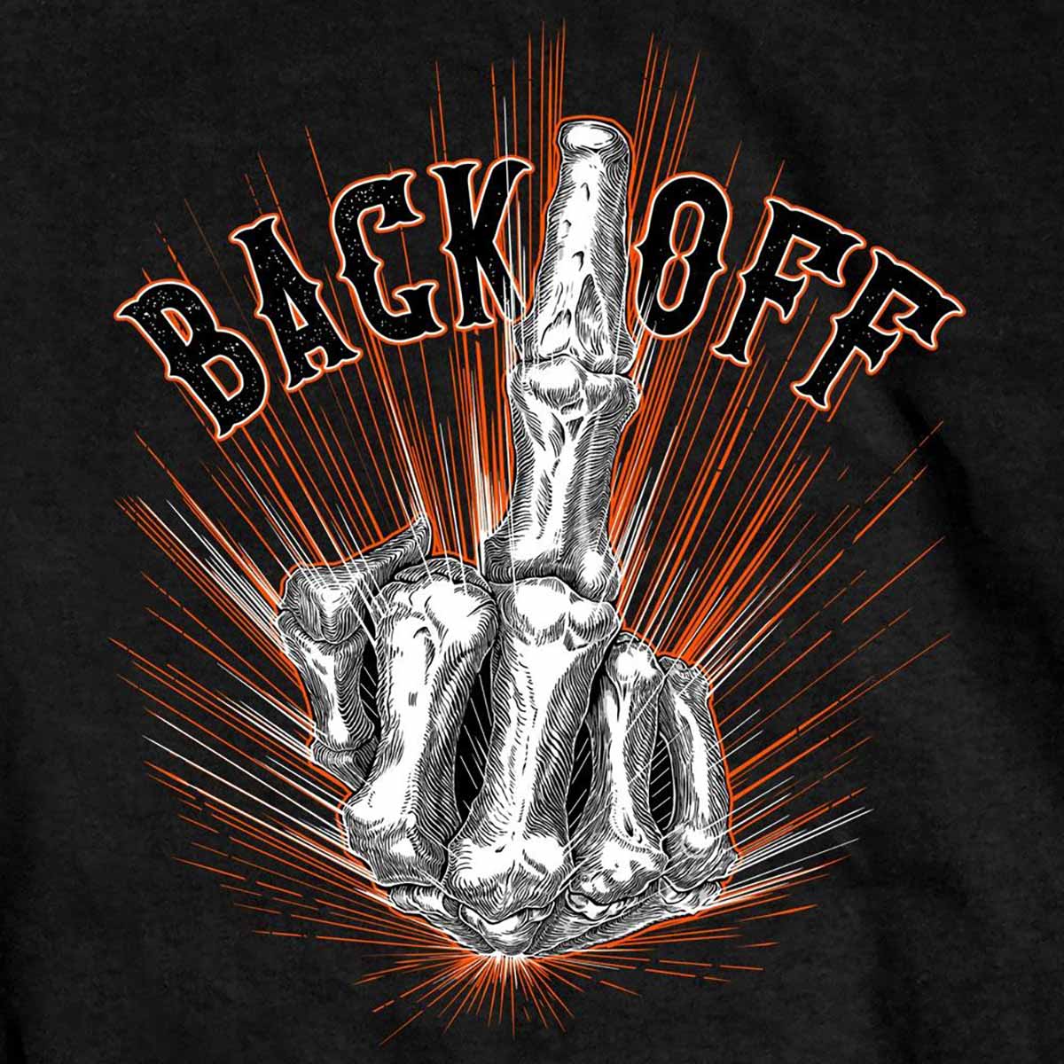 This 100% heavyweight Cotton men's printed t-shirt comes in the color Black and features a vibrant, screen printed image of a bone finger with the words "BACK OFF"® proudly printed on the back. Get yours today!