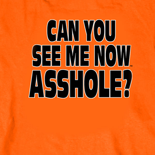 This Hot Leathers Exclusive Shirt in safety Orange proudly boasts "BIKERS AGAINST DUMB DRIVERS" on the left hand front chest area and has long sleeves with a screen printed image of tribal flames crawling up the front of each sleeve. On the back boldly displayed is the text "CAN YOU SEE ME NOW ASSHOLE?"