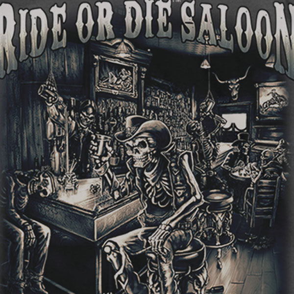 This Hot Leathers men's printed t-shirt in the color Charcoal text reads "Ride or Die Saloon" and features a design of a skeletons lounging at the bar.