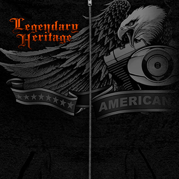 This men's Zip-Up Hooded Sweatshirt in the color black features a bright screen printed image of a Ghost Eagle with the text "Legendary Heritage" and "American", with a similar design on the sleeves.