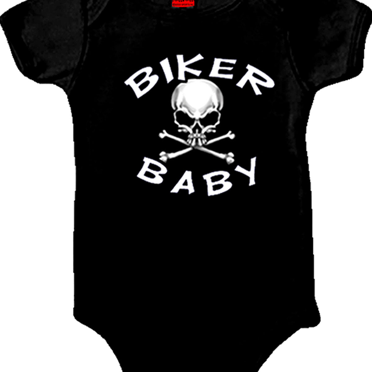 This lovable baby bodysuit comes in the color black and features a screen-printed image of skull and crossbones and reads "BIKER BABY".