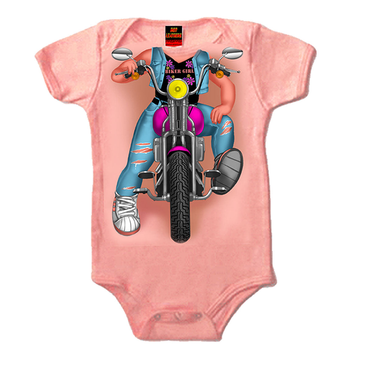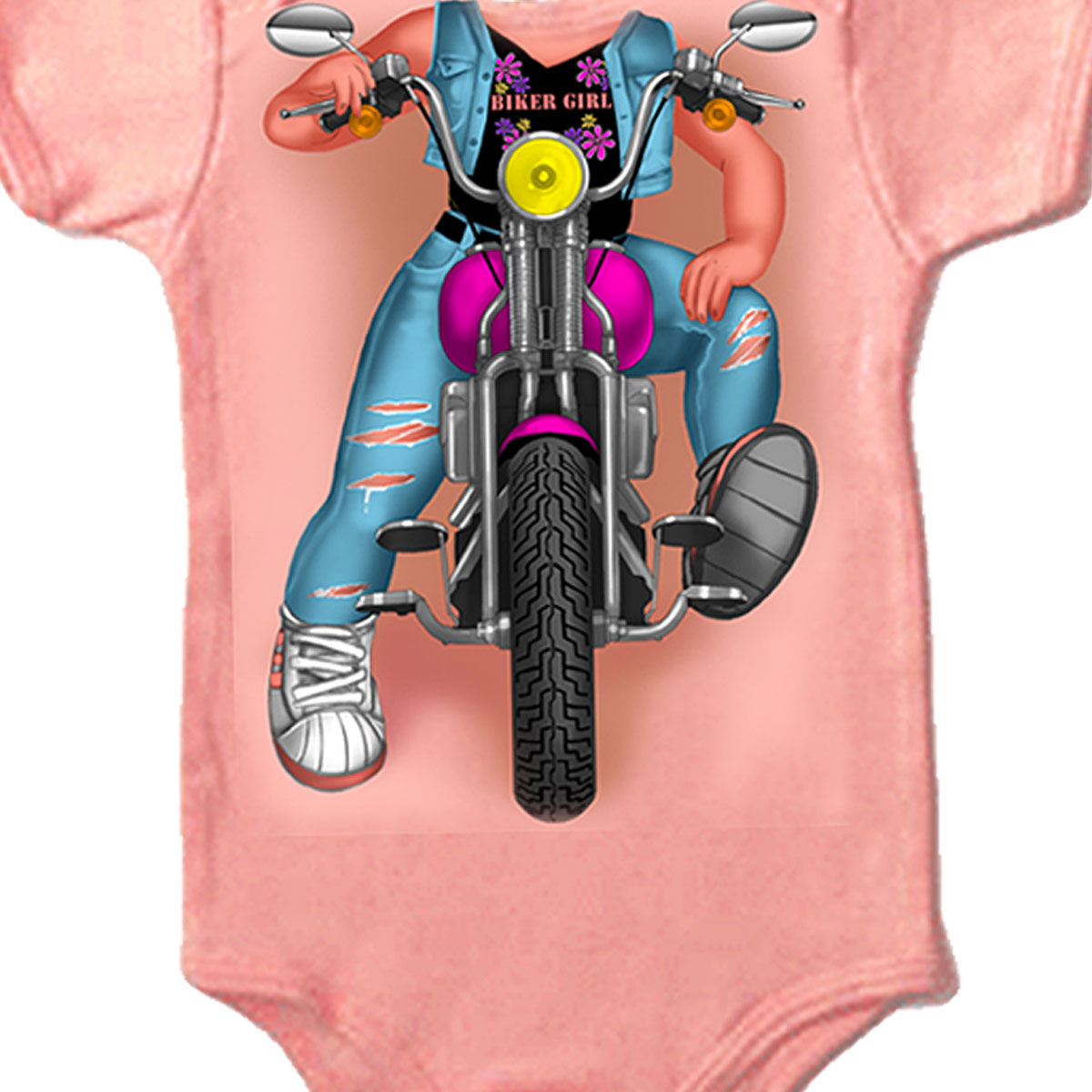 This baby bodysuit comes in the color pink and features a screen printed image of a "headless" biker girl starting at neckline.
