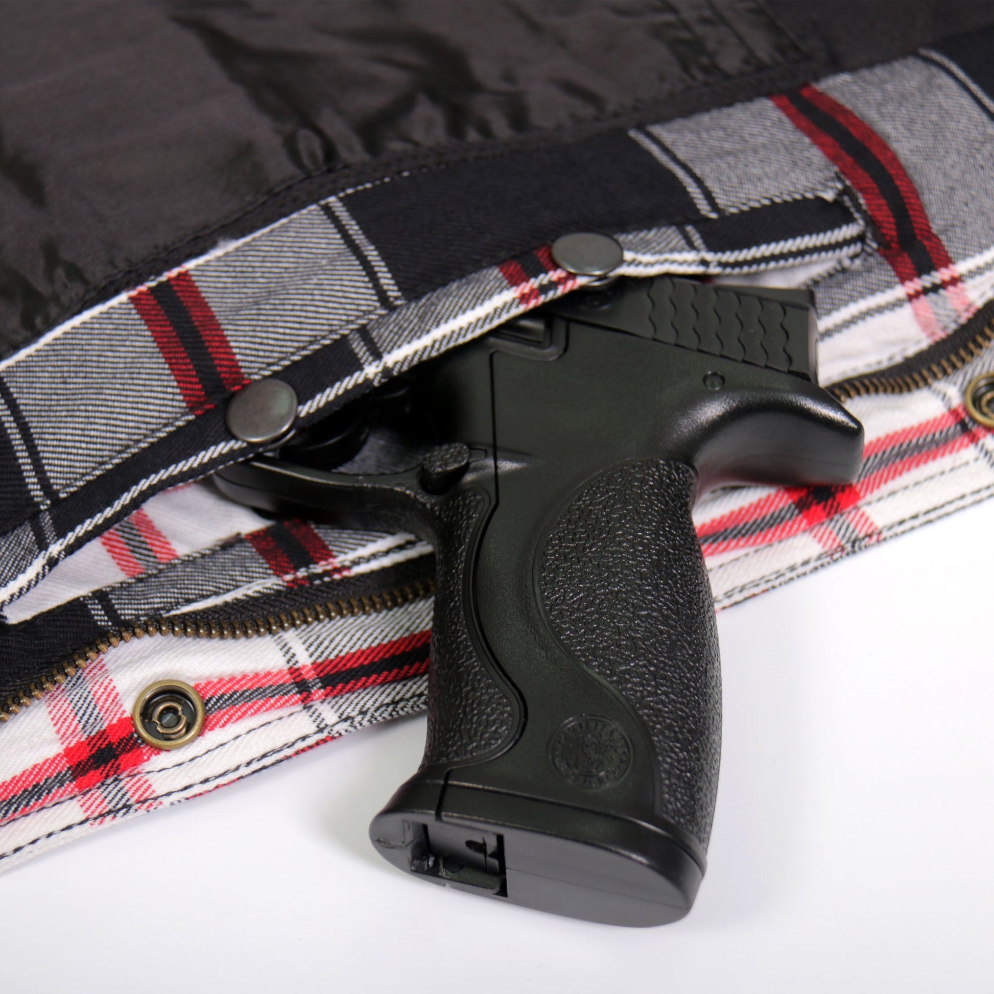 This Hot Leathers armored flannel is made of 100% heavy cotton. It features two inside carry concealed pockets and a zippered media pocket. There is a full zipper and snap front. CE approved removable armor on shoulders and elbows. Another great feature is the underarm zip vents, helps cool you down on those warm days.