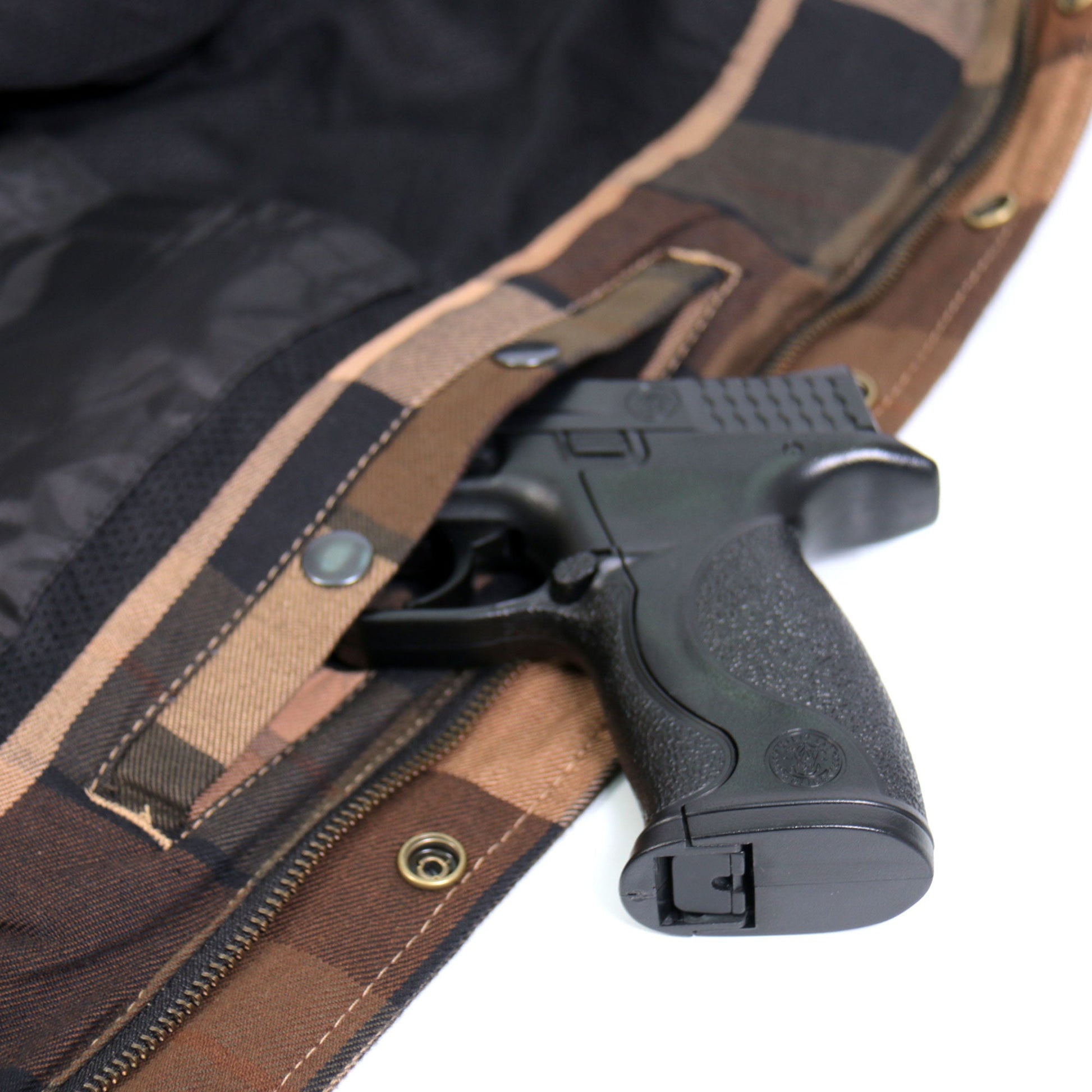 This Hot Leathers armored flannel is made of 100% heavy cotton. It features two inside carry concealed pockets and a zippered media pocket. There is a full zipper and snap front. CE approved removable armor on shoulders and elbows. Another great feature is the underarm zip vents, helps cool you down on those warm days.