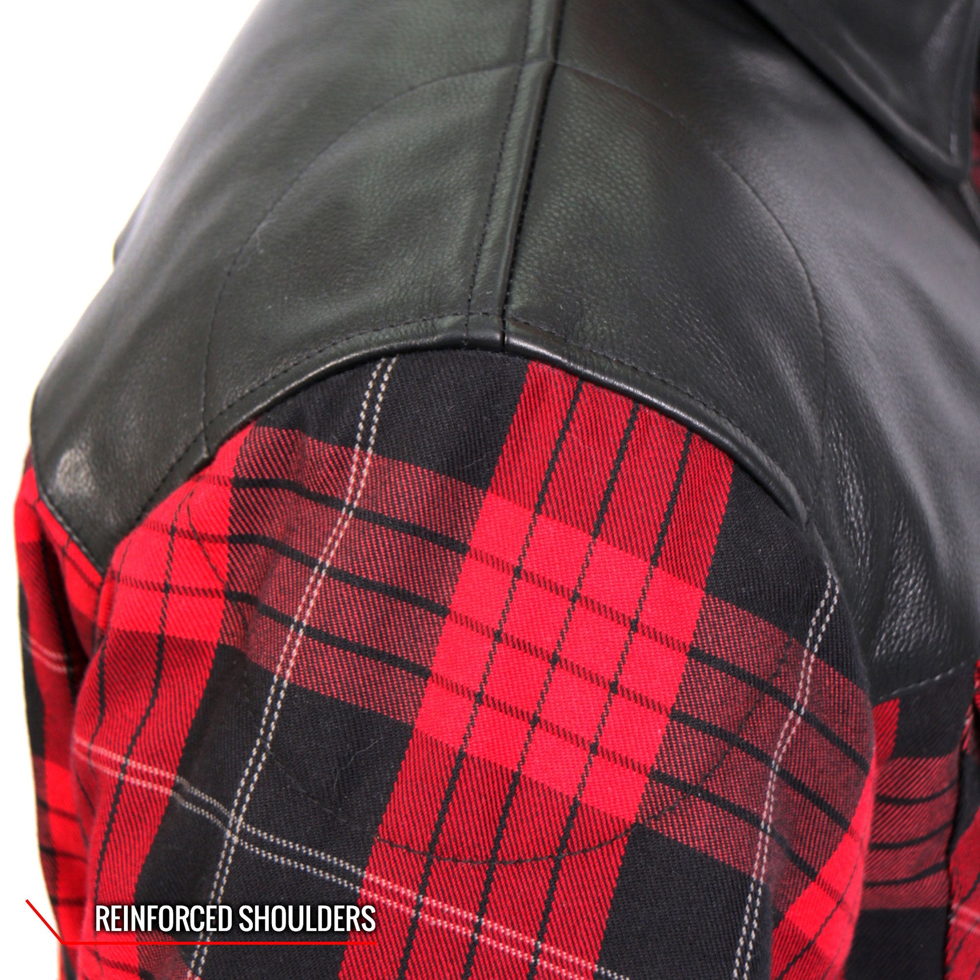 Hot Leathers JKM3201 Men's Motorcycle style Red and Black Reinforced Leather and Plaid Flannel Biker Shirt