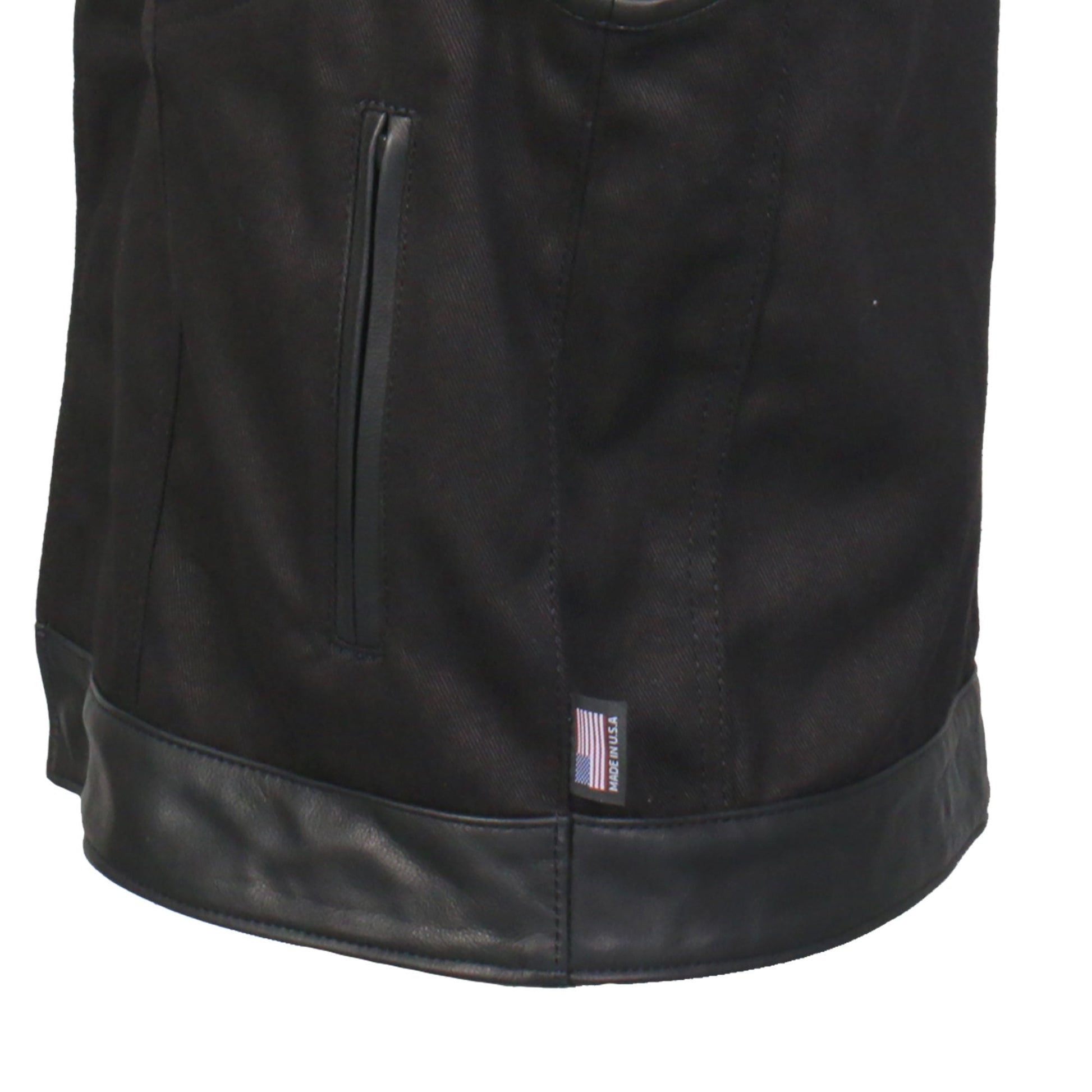 Hot Leathers all new American Made men's club style denim and leather riding vest. All Hot Leathers USA Made vests are made in-house at our facility in CT. This vest is built using heavyweight black denim and naked cowhide. This Hot Leathers denim vest is is super soft for that already broken in feel. It comes fully lined with a flannel lining. This vest has four outside and two inside storage pockets. Another great feature is a full hidden YKK Zipper and snap front. Full one piece back gives you plenty of room to have your favorite Hot leathers patches sewn on. All Hot Leathers USA Made Jacket, Chaps & Vest come with a 5 year Warranty.