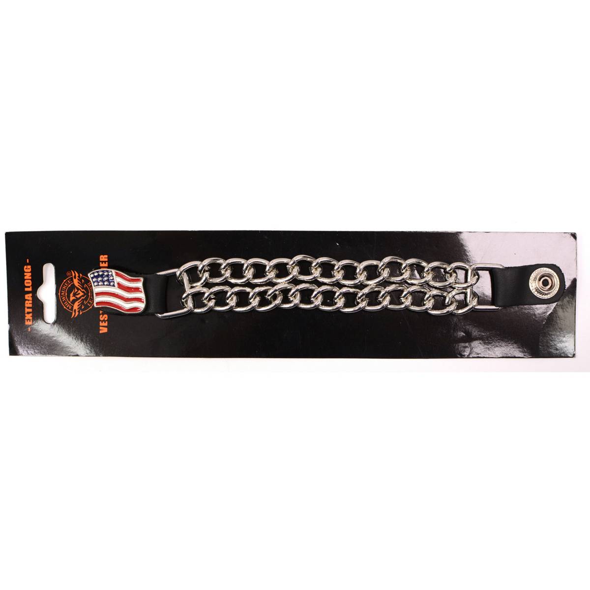 - Chrome Chain | Our motorcycle vest extenders feature diamond cut stainless steel chrome-finish with double chains that are 6 inches long. Heavy duty and corrosion resistant. These vest chains extenders are designed to increase the size or adjust the fit, and are typically used in activities like motorcycle riding, where a snug fit is important for safety and comfort. They keep your outfit in place without any flapping around.