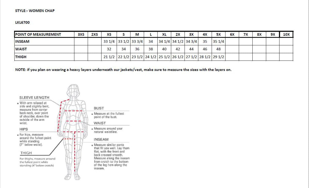 - Ladies leather can run two sizes smaller – measure your chest size!