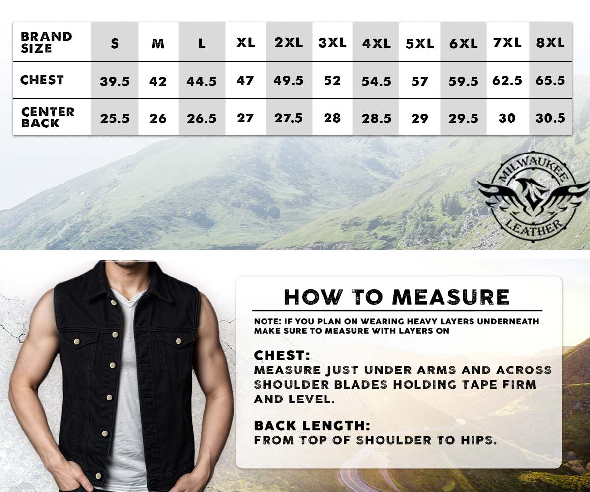Milwaukee Leather MDM3010 Men's Black Denim Club Style Biker Vest with Leather Trim and Hidden Zipper