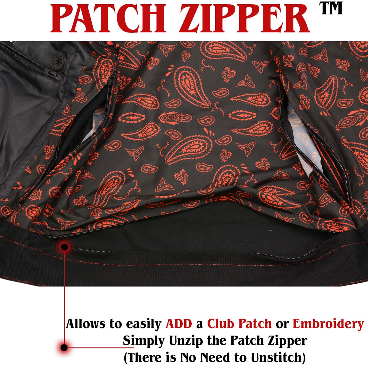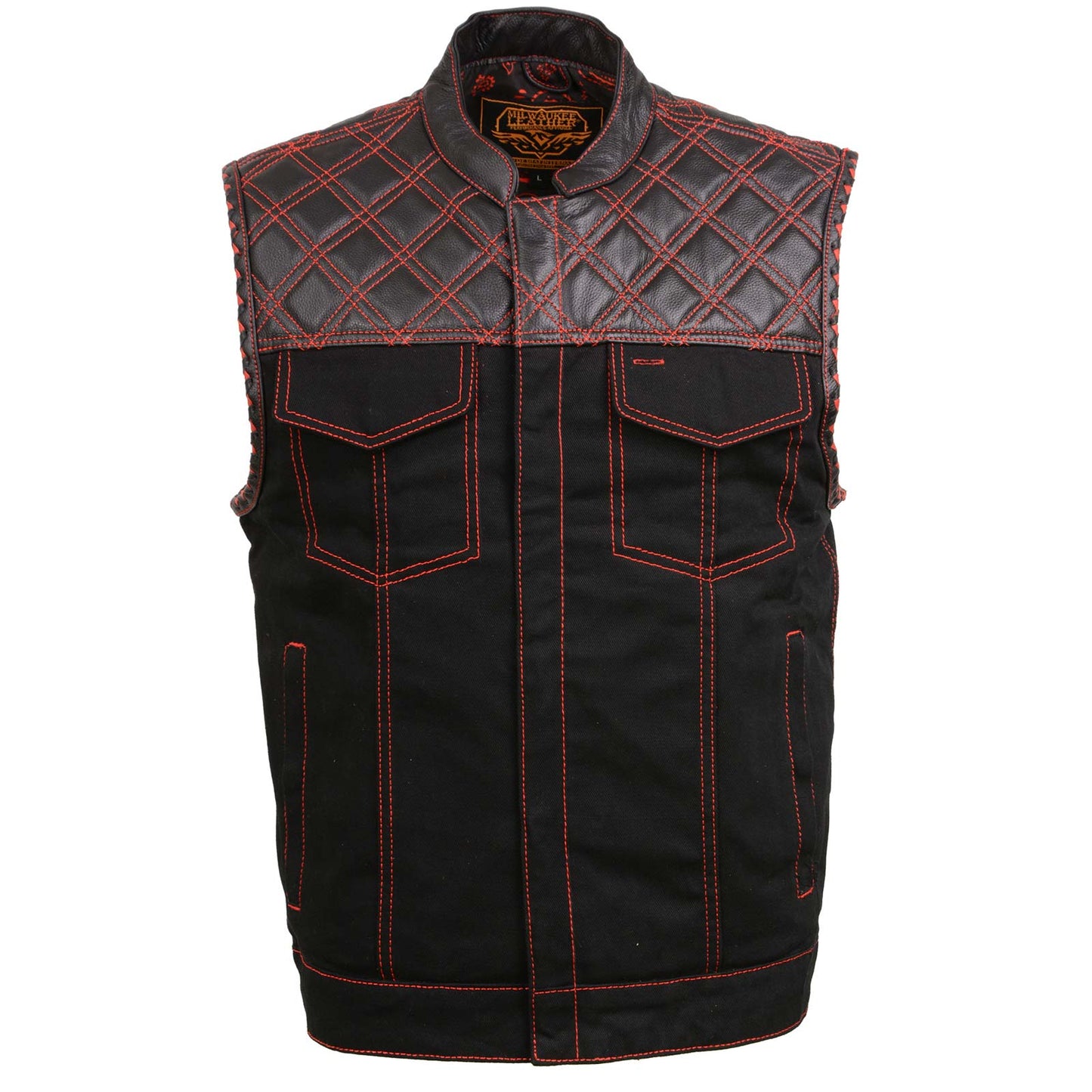 Milwaukee Leather MDM3036 Men’s Wrecker Club Vest – Black Denim & Leather, Diamond Quilt, Red Stitch