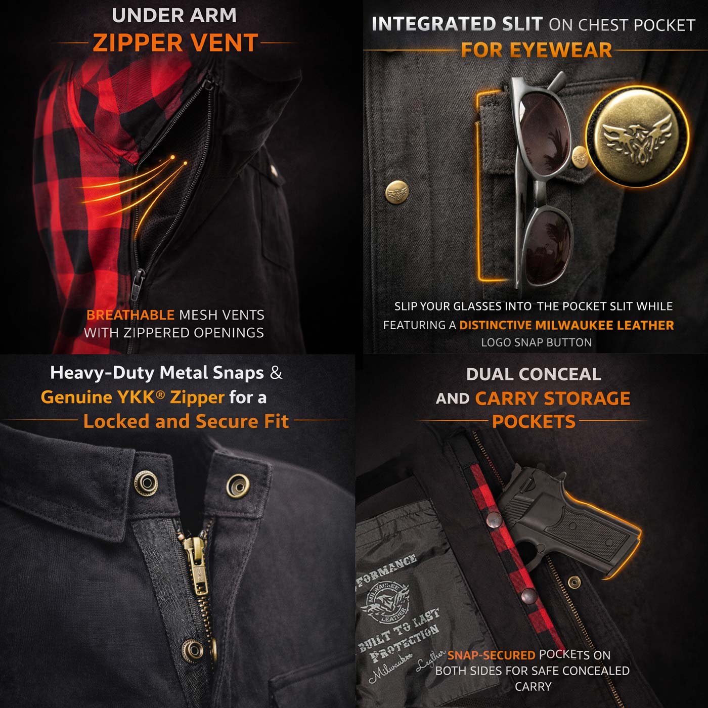 Milwaukee Leather Men’s Two-Tone CE Armored Flannel - Solid Front / Plaid Back - Reinforced w/ Aramid Fibers - MPM1671