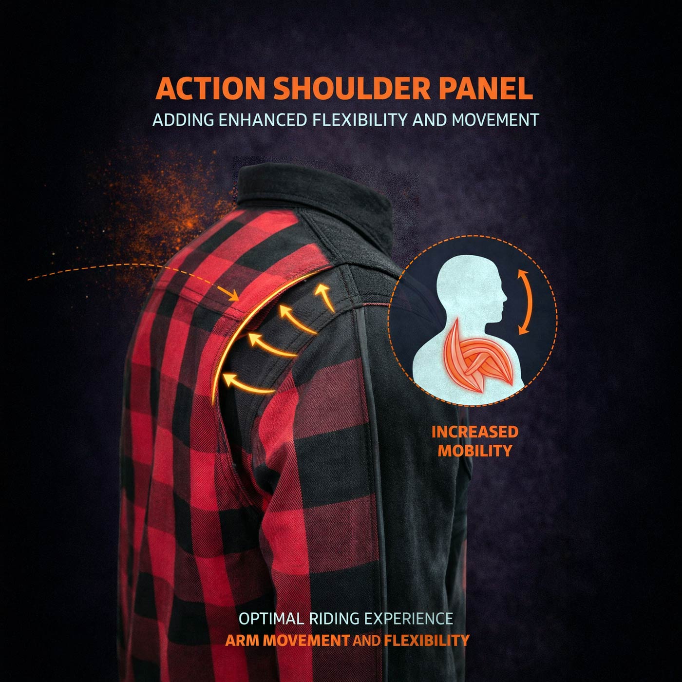 This two-tone version keeps the armored flannel formula—Kevlar® reinforcement, CE armor, vents, mesh liner—and adds reflective arm piping for a subtle low-light edge. From the cockpit you get a clean black front; from behind it reads like a classic buffalo-check flannel.