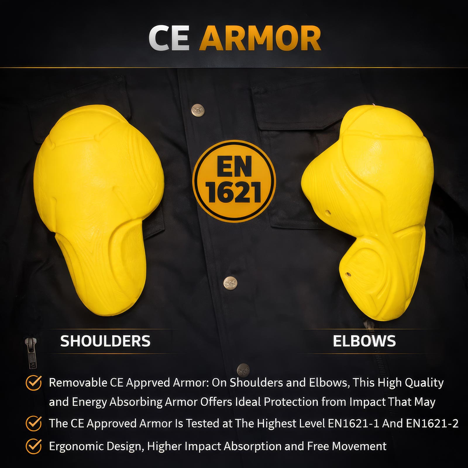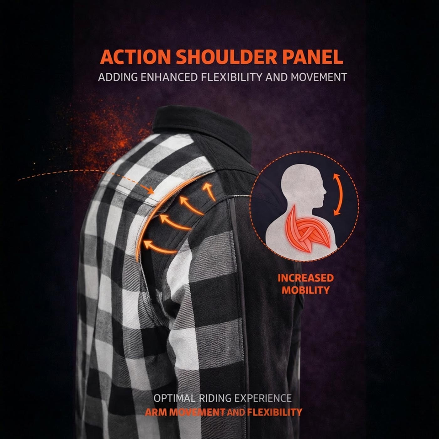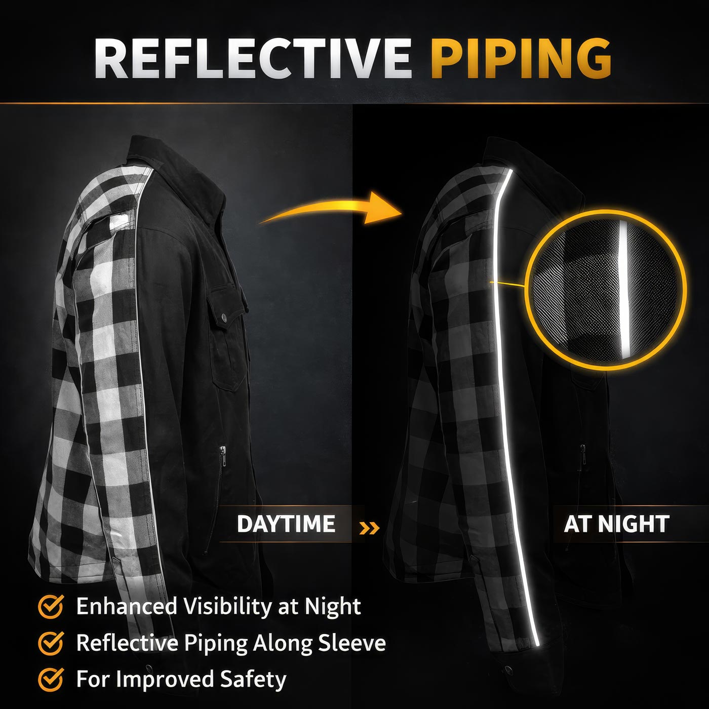 This two-tone version keeps the armored flannel formula—Kevlar® reinforcement, CE armor, vents, mesh liner—and adds reflective arm piping for a subtle low-light edge. From the cockpit you get a clean black front; from behind it reads like a classic buffalo-check flannel.