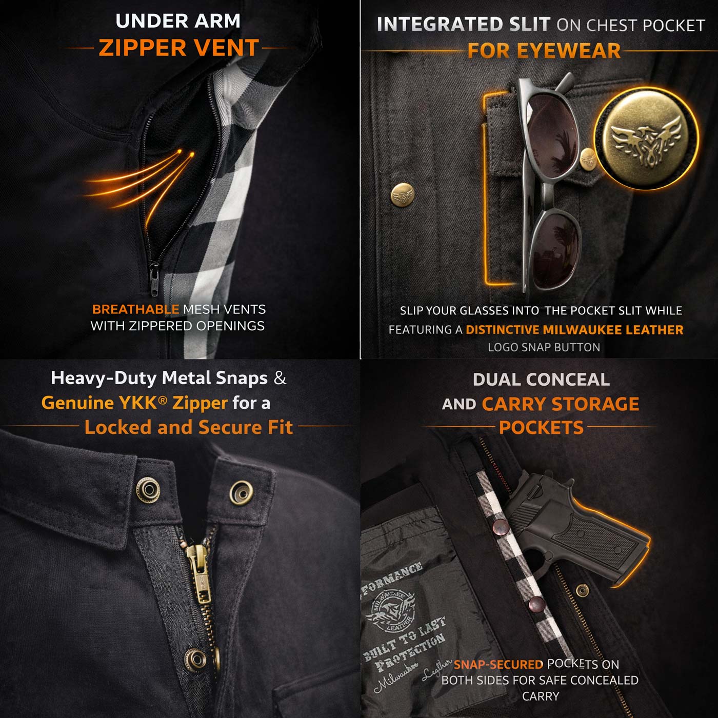 Milwaukee Leather Men’s Two-Tone CE Armored Flannel - Solid Front / Plaid Back - Reinforced w/ Aramid Fibers - MPM1673