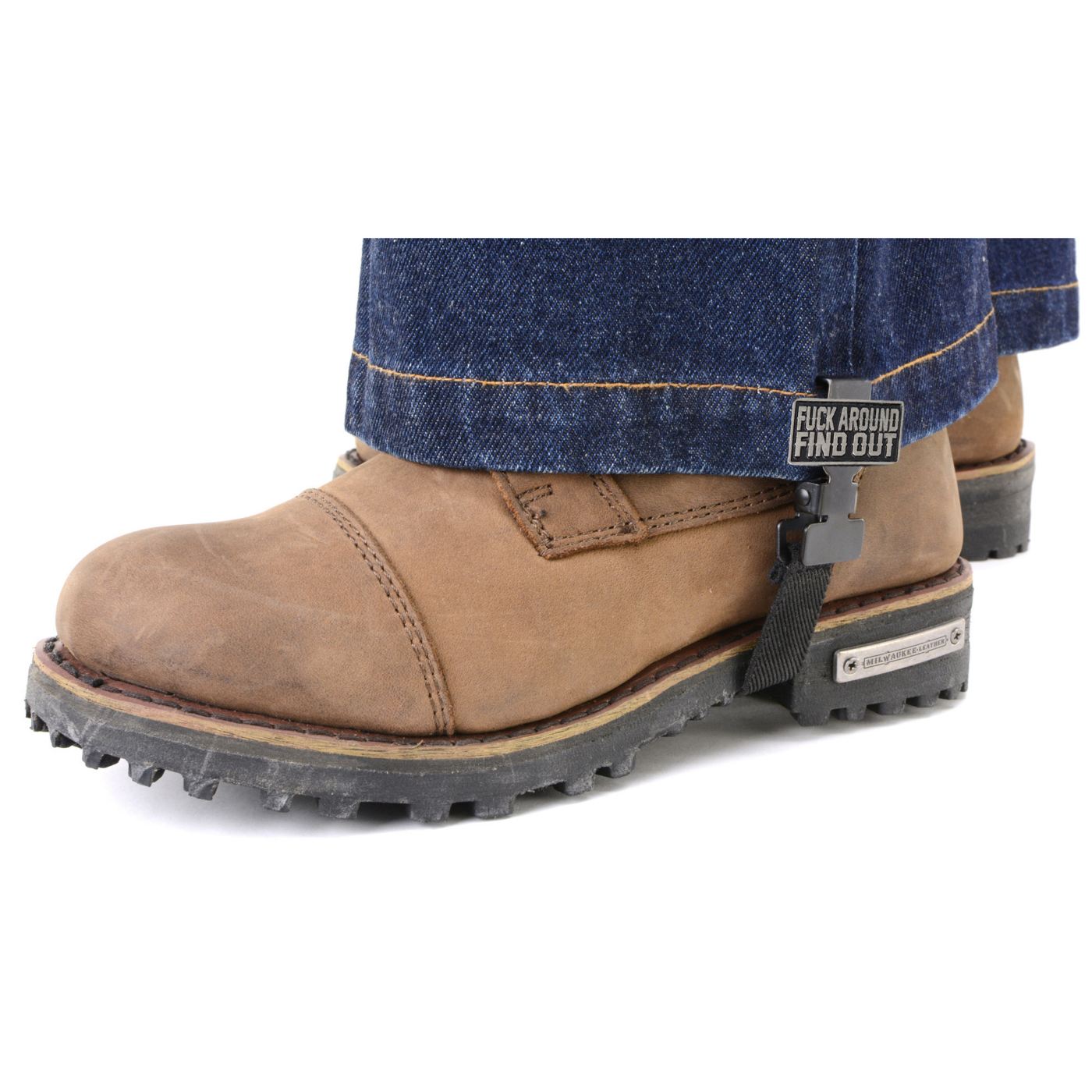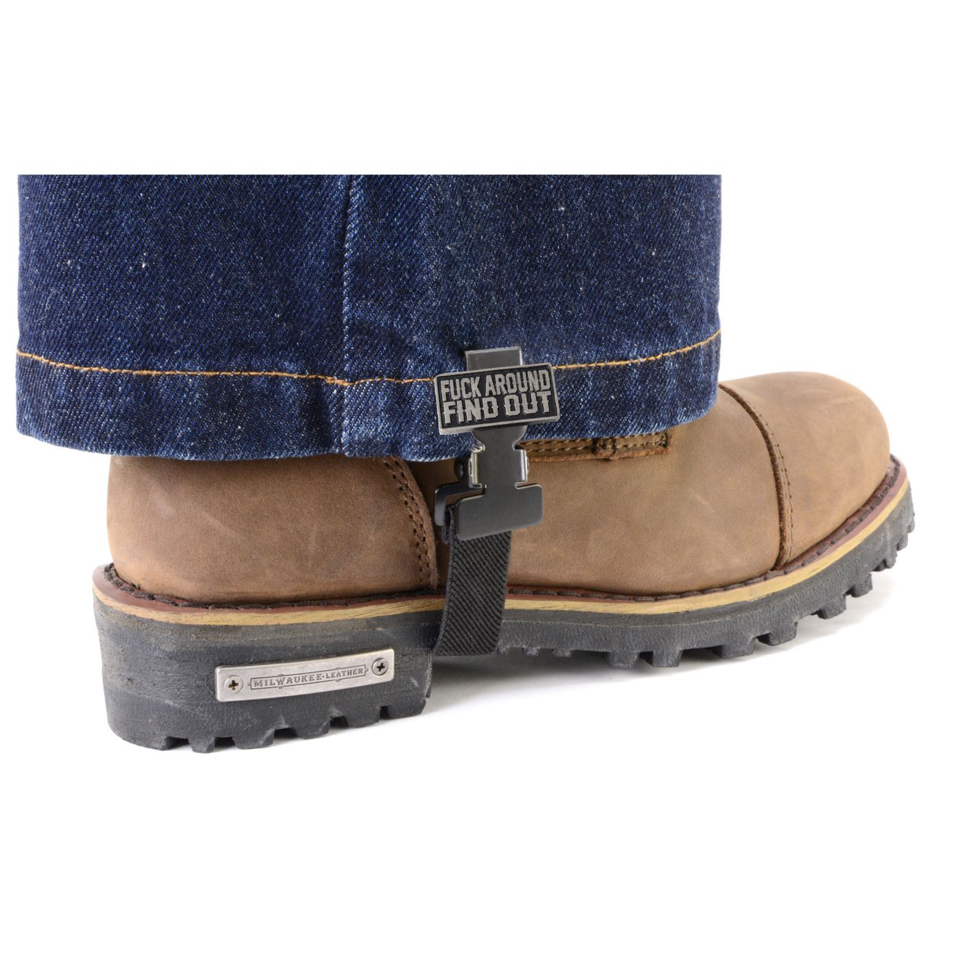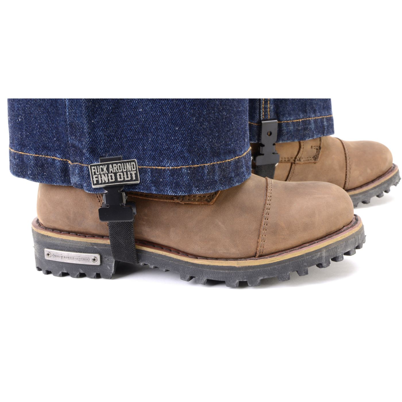 The We The People emblem is the Milwaukee Leather finishing touch on a clip that just works. Sold as a set of two — both legs covered, right out of the package.