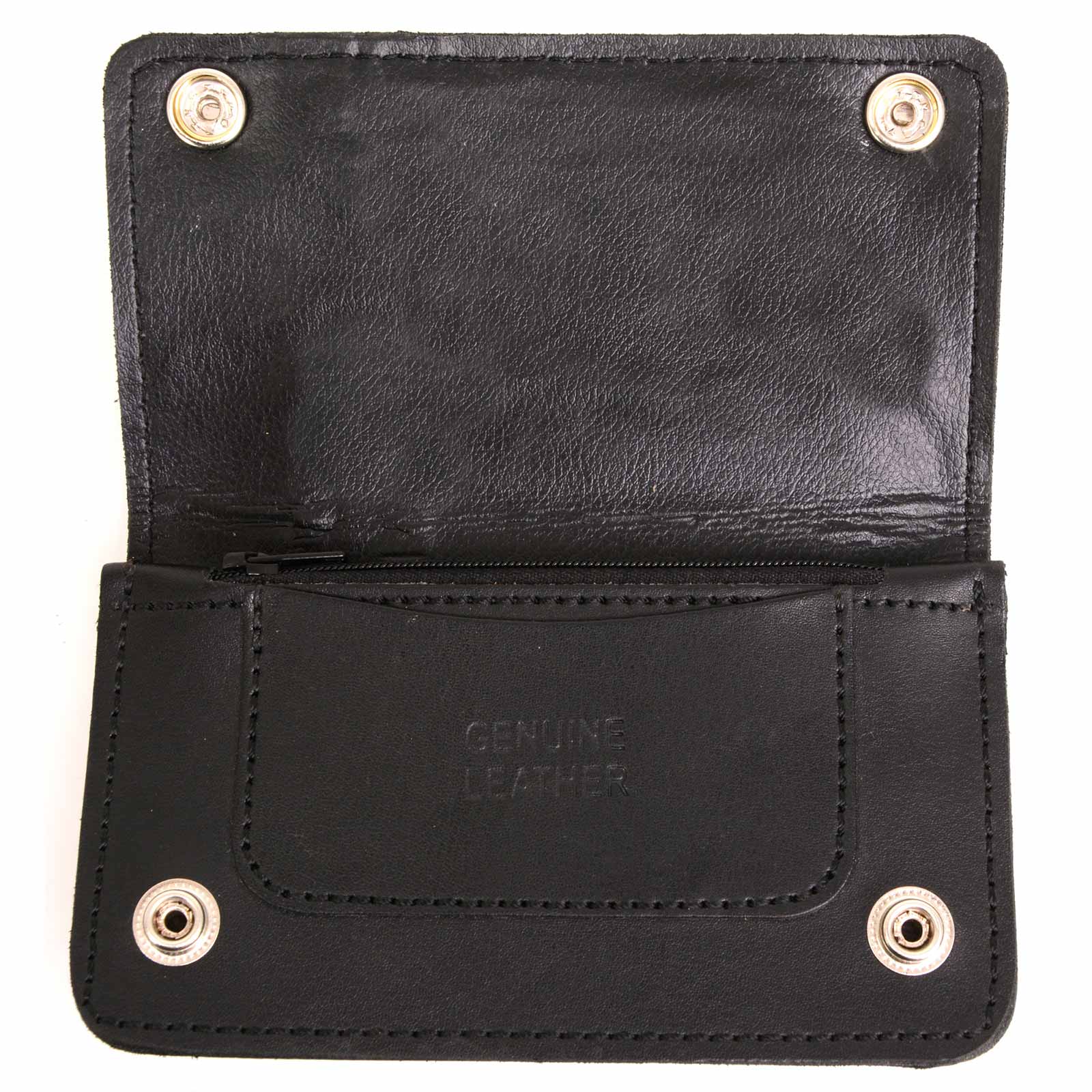 - Men’s Bi-fold Wallet with Snaps | Our men’s wallet with chain is hand made to perfection and made from full-grain leather. This men’s bifold wallet has a leather snap belt clip & comes with a 10 gauge, 14” steel chain that can be attached to a belt loop or other secure point to prevent loss or theft while riding your motorcycle.